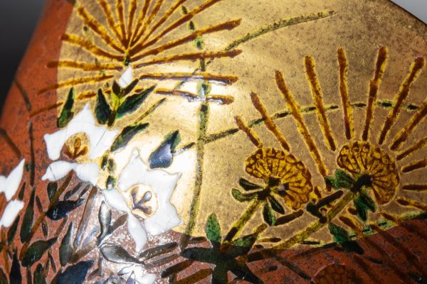 九谷焼伝統の和絵の具を用いて製作、日展を中心として作品を発表し続けています。 画像のように保管による多少の経年はありますが、どの他には目立った傷みも無く良好な状態です。
