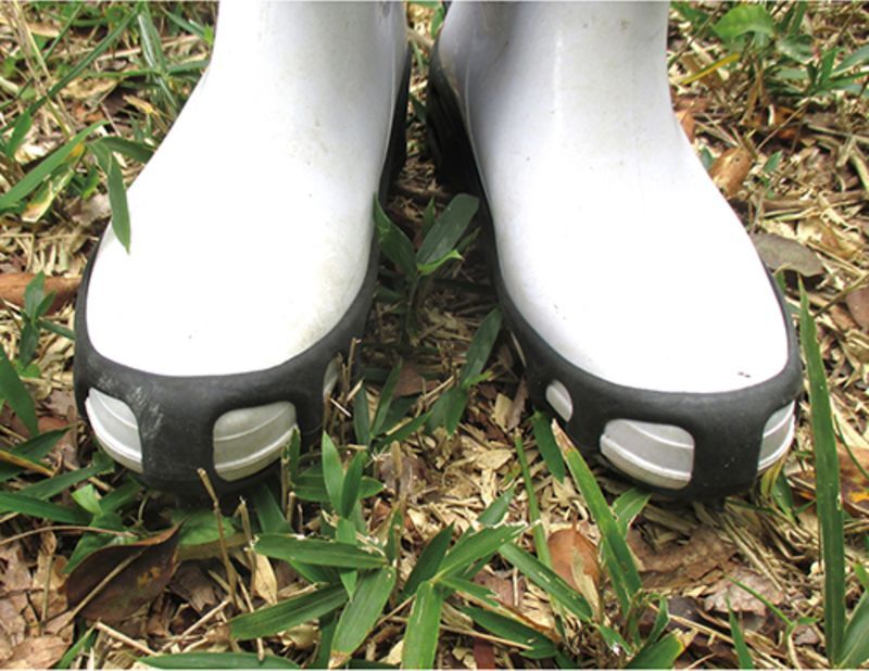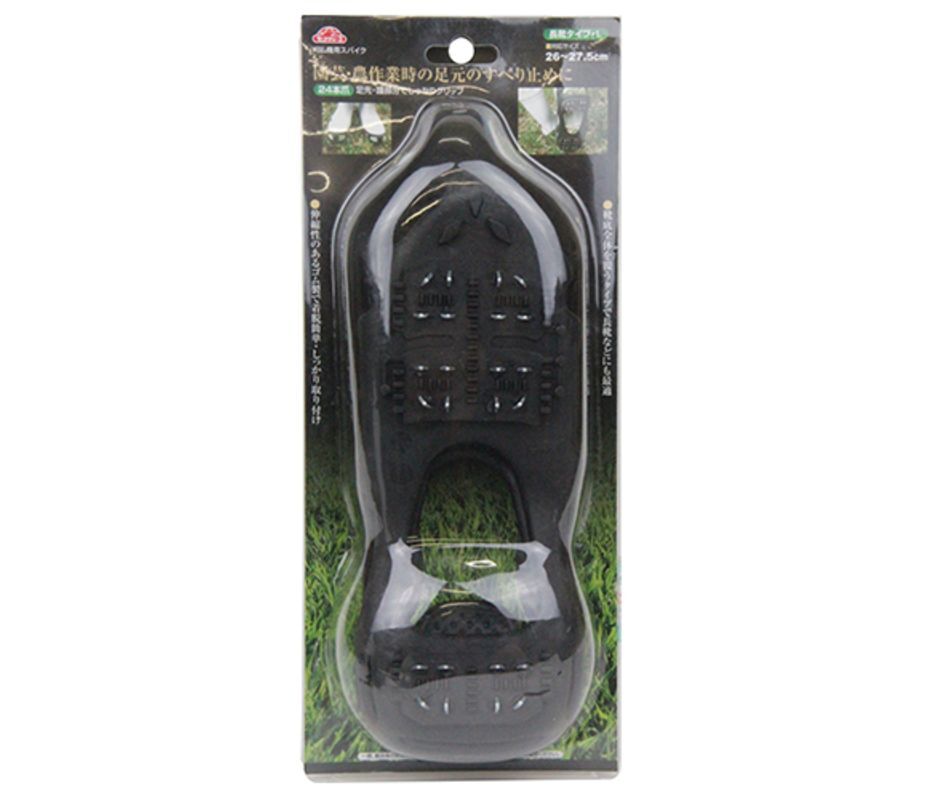 機能・特徴 | ・刈払作業時等で傾斜地や、不安定な場所での作業時に安定して作業する ことができる、簡易型取り付け型のスパイクです。 ・24本の爪が足先と踵で、しっかりグリップします。 ・靴底全体を覆うタイプなので、長靴などにもしっかりフィットします。 ・本体は伸縮性のあるゴム製ですので、着脱は簡単に行える上、しっかり 取り付けられます。 |