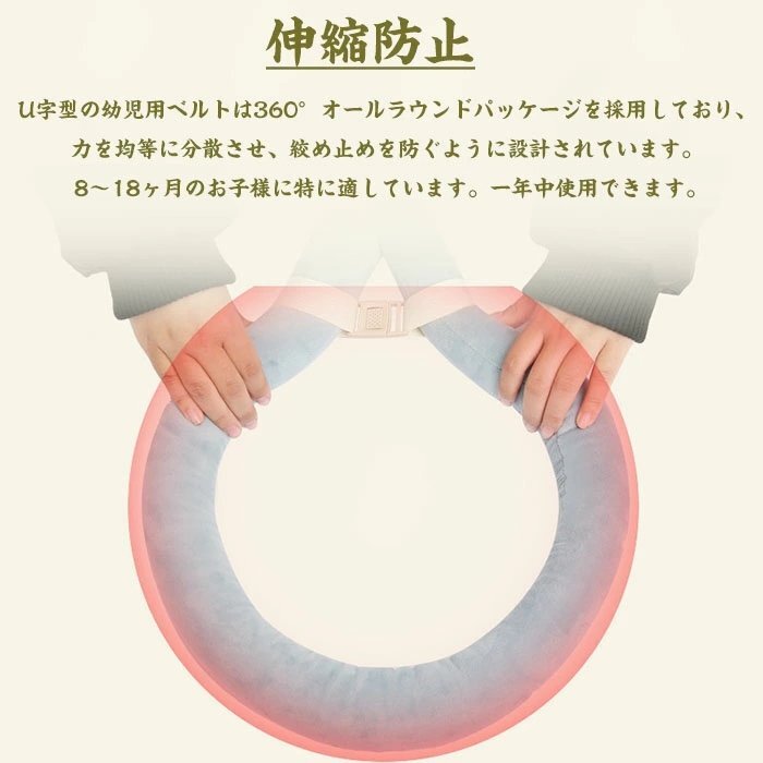 伸縮防止:従来の幼児用ベルトのストレスポイントは脇の下に集中していますが、U字型の幼児用ベルトは360°オールラウンドパッケージを採用しており、力を均等に分散させ、絞め止めを防ぐように設計されています。 8~18ヶ月のお子様に特に適しています。一年中使用できます。
