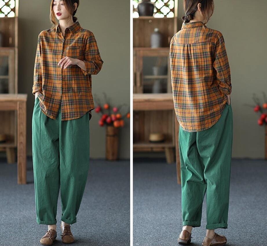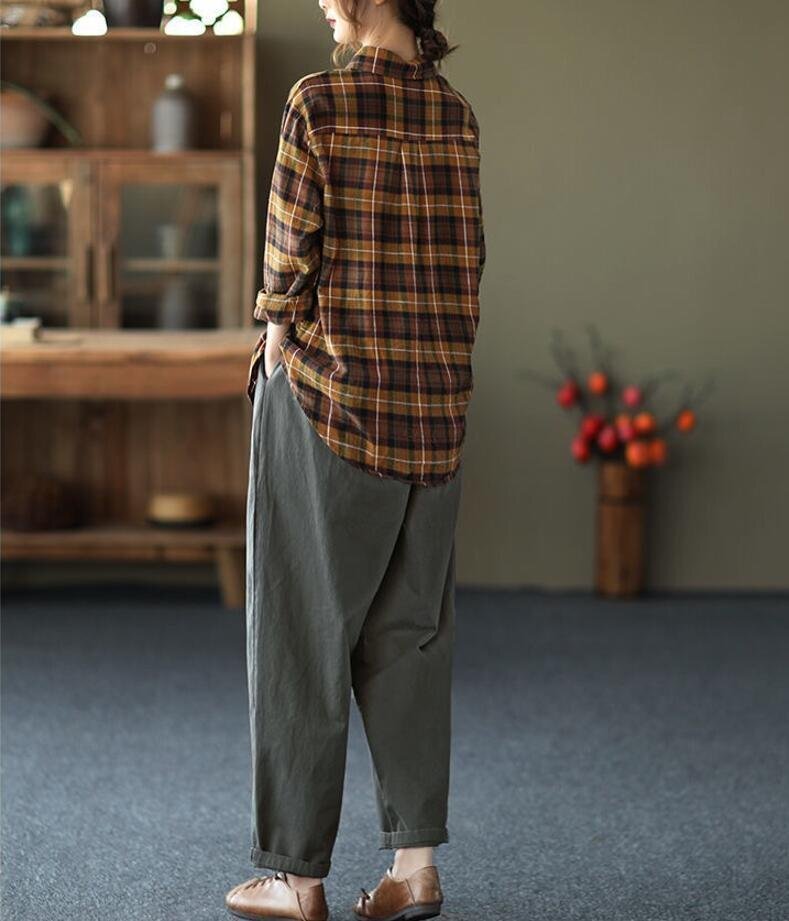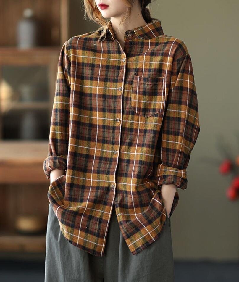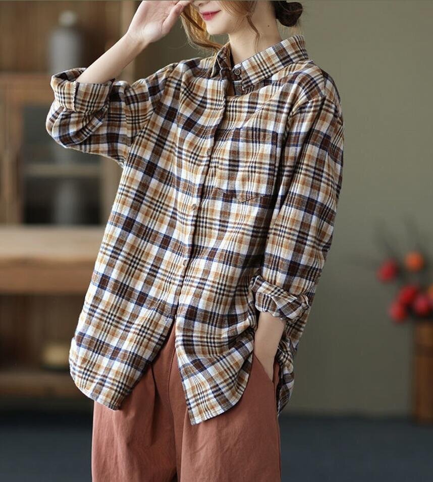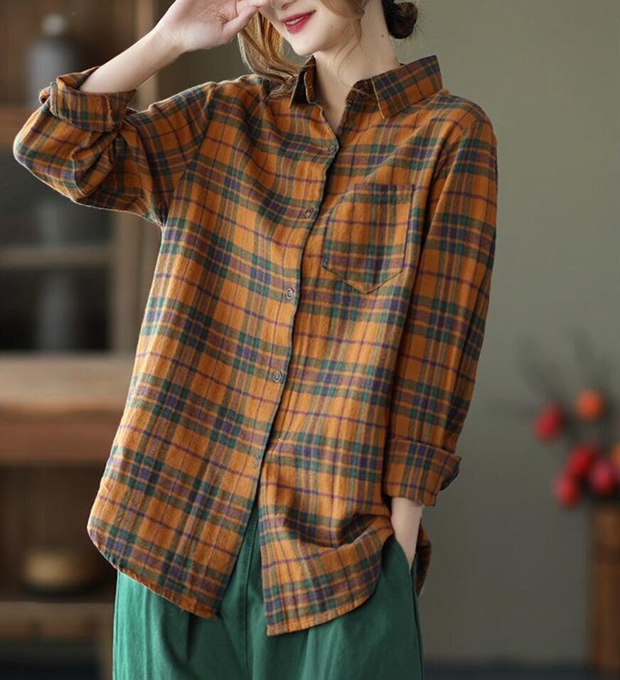 春新品 カジュアル トップス チェック柄 着痩せ 大きいサイズ チュニック 長袖 ブラウスシャツ★黄 /XLサイズ