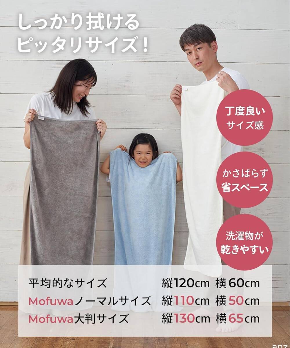 コンパクトサイズで効率的 Mofuwaバスタオルは110cm x 50cmのコンパクトサイズですが、吸水性が高く、体全体をしっかりお拭き頂けます。コンパクトなのでかさばらないのも特徴です。