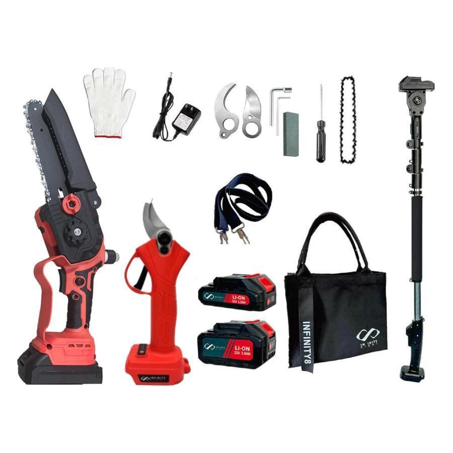 2段延長棒×1 重さ約1.45kg、6寸チェーンソー×1 重さ約0.8kg、電動ハサミ×1 重さ約0.6kg、1.5Ahバッテリー×1 重さ約0.3kg/個、3.0Ahバッテリー×1 重さ約0.6kg/個、充電器×1、