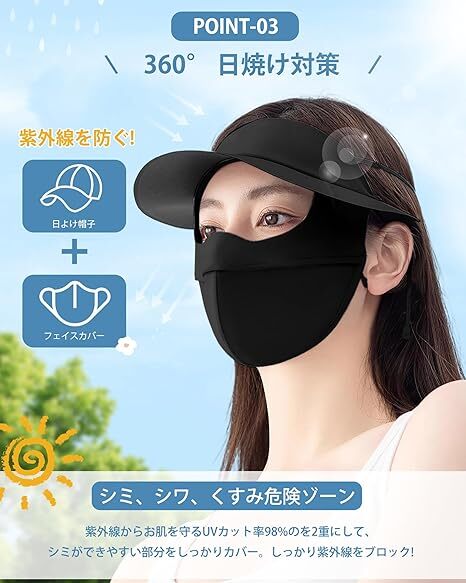 【完全保護、紫外線防止】この日焼け止めマスクは紫外線を99%効果的に遮断します。広めのつばで日焼け防止範囲を拡大し、目尻を保護します。顔を360°完全にカバーすることで、顔を最大限に保護し、優れた日焼け防止効果を発揮します。アウトドア活動、長時間の日光浴、日常の保護など、このフェイスカバーは完全で快適な保護を提供します。 軽量で折り畳み可能なため、携帯に便利で、いつでも取り出して使用できます。