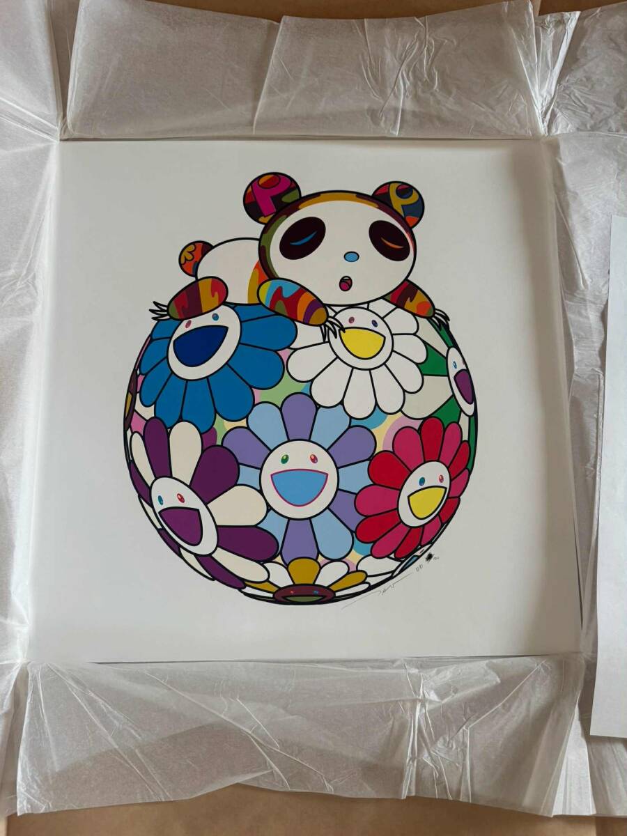 「真作」村上隆 版画 お花の玉の上で、パンダの子供がすやすや。寝ています。