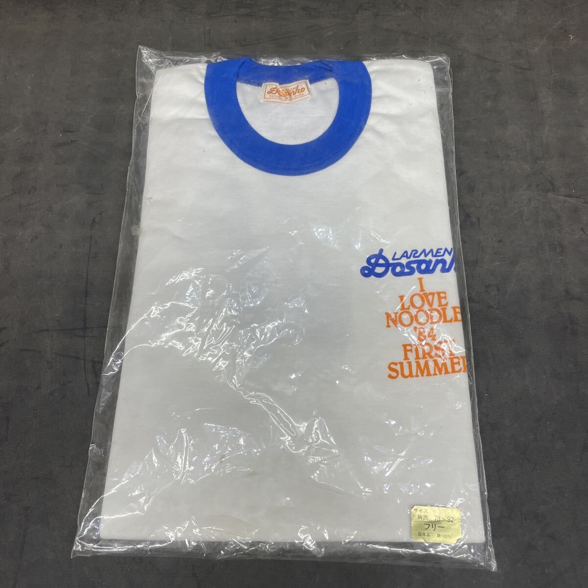 G3135 【希少!どさん子ラーメンTシャツ】 1984年 未開封品 サイズ/フリー 胸囲78~92 デッドストック 青×白 長期保管品