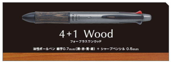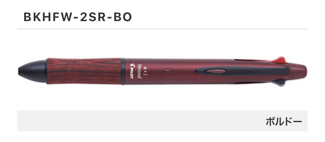 品番 BKHFW-2SR-BO ボルドー 製品の特徴 4色ボールペン+シャープペンシル ボールペン4色(黒・赤・青・緑)とシャープペンシルを搭載した多機能筆記具です。 4色のボールペンをシチュエーションごとに使い分ければ、筆跡を見やすくコーディネートできます。シャープペンシルなら思ったこと、感じたことをためらうことなくスピーディに書き消しできます。 木製グリップ グリップに樹脂含浸カバ材を使用。手になじむ木の温もりを お楽しみいただけます。 ~樹脂含浸カバ材~ 薄い木材板に圧力釜で樹脂を含ませ、幾層にも重ねて 熱圧成形した素材です。 強度と耐久性だけでなく温もりと美しさを兼ね備えています。 上質感あふれる塗装・金具 落ち着いた色合いのマット塗装と金具の黒色仕上げにより、上質感を演出しています。