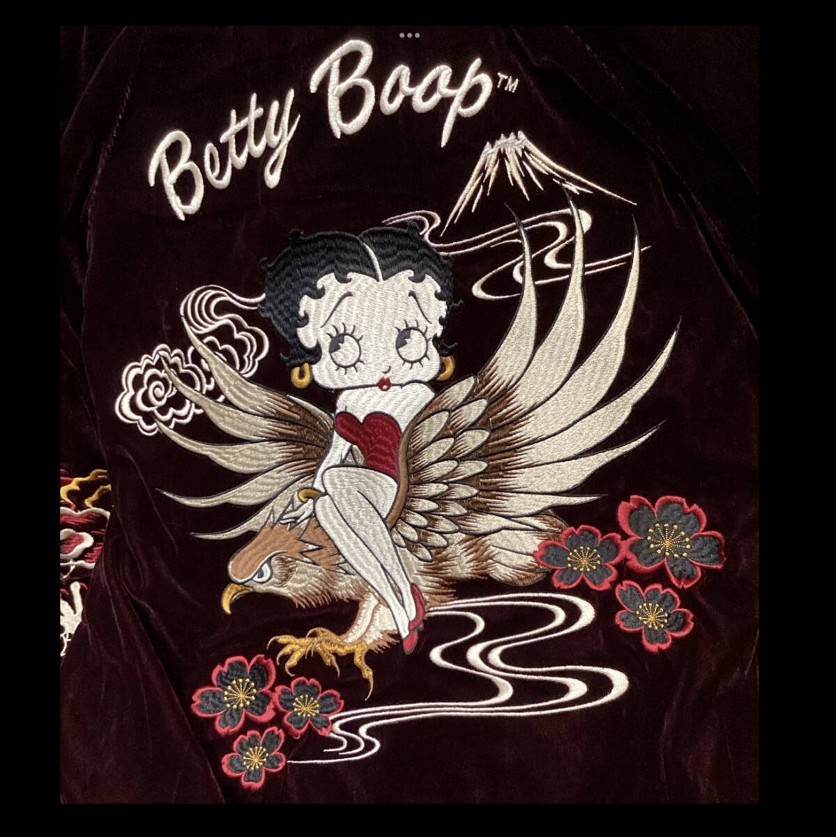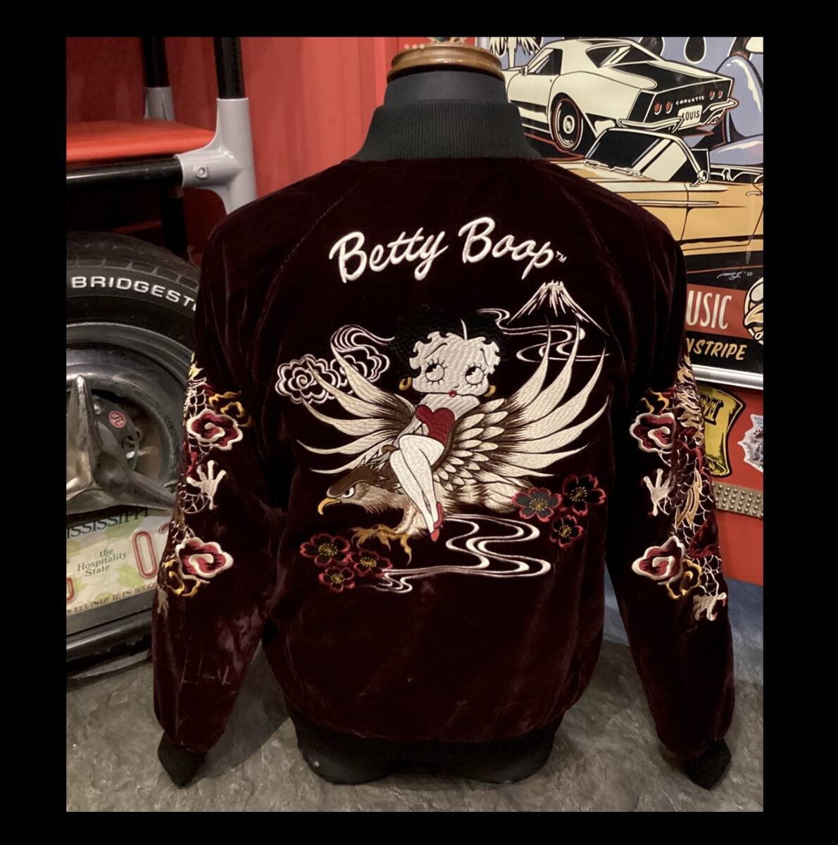 ★ 世界で愛され続けるセクシーポップキャラクター「BETTY BOOP」から高級感ある上質レーヨン素材面とベルベット素材使用 、両面ともに豪華刺繍デザインが施されたリバーシブルスカジャンです。タウンユースでもインパクトのあるデザインで バイカーには季節問わずの プレミアムアイテムです。