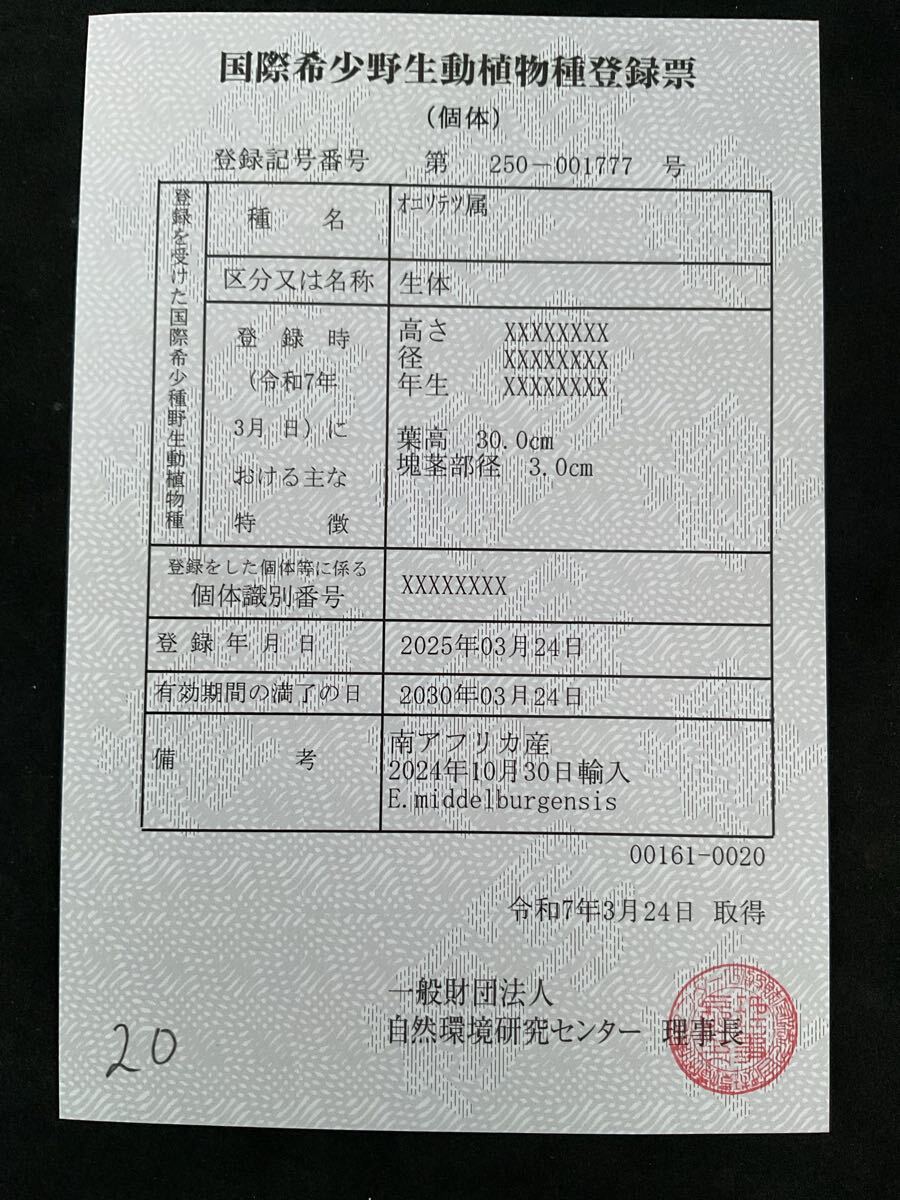種の保存法により、個体の譲り受け後は30日以内に譲受けの届出が必要となります。要は名義変更が必要な植物です。