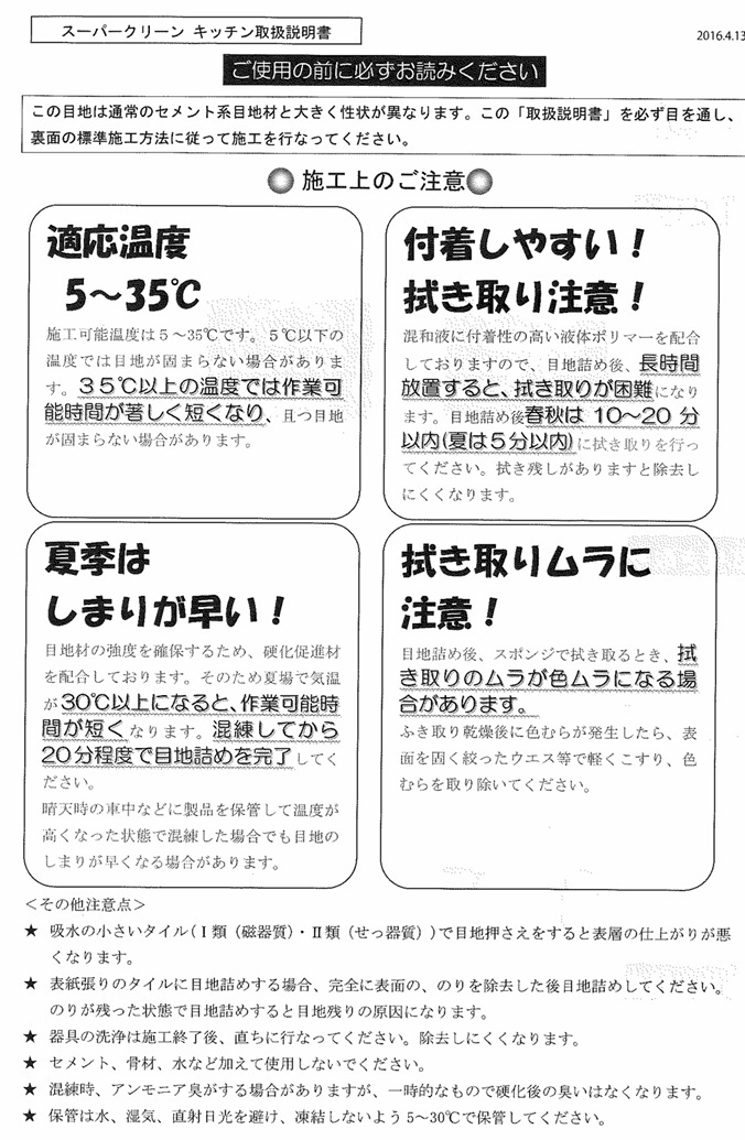 | 油汚れ防止目地材 スーパークリーン キッチン (内装用目地材) 色:KS-22K(グレー) 形状:目地剤0.9kg+混和液/セット(1セット) 【スーパークリーンキッチンの使い方】 ※目地剤0.9kg+混和液/セット(1セット)での出荷対応 主成分:セメント、骨材 適用目地幅:1~10mm 使用量目安 0.2~0.3kg/m (200mm角厚さ5.5mm、目地幅2.25mmの場合) 0.3~0.5kg/m (100mm角厚さ5.5mm、目地幅2.25mmの場合) 1.0~1.3kg/m (50mm角厚さ6mm、目地幅3mmの場合) ●油汚れに強いキッチン専用目地材です。 ●キッチンバックの内装壁タイルや、タイルカウンター等にご使用できます。 ●キラミック(抗菌)仕様で細菌の繁殖を抑制し、清潔な空間を提供します。 |