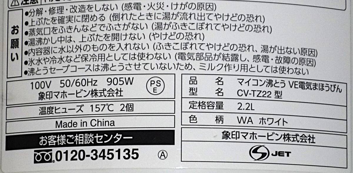 象印 ZOJIRUSHI マイコン沸とう VE電気まほうびん 優湯生 2.2L CV-TZ22型 ホワイト 2021年製