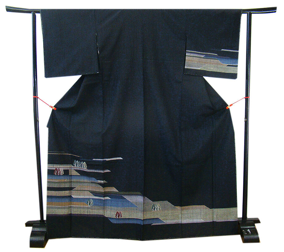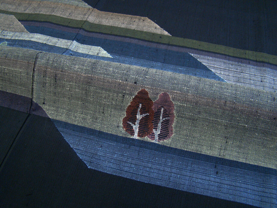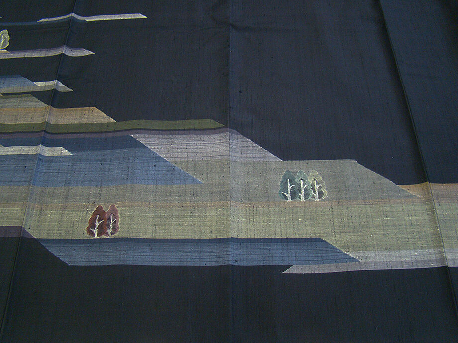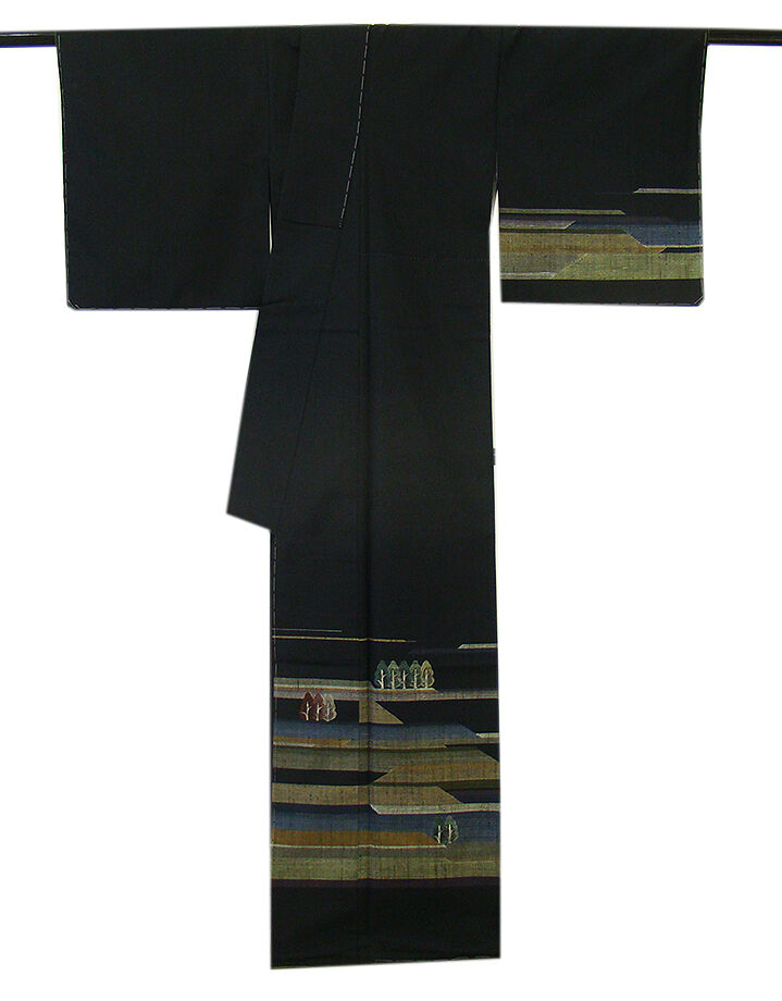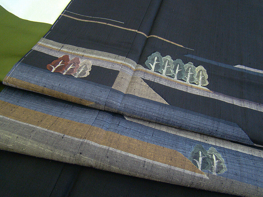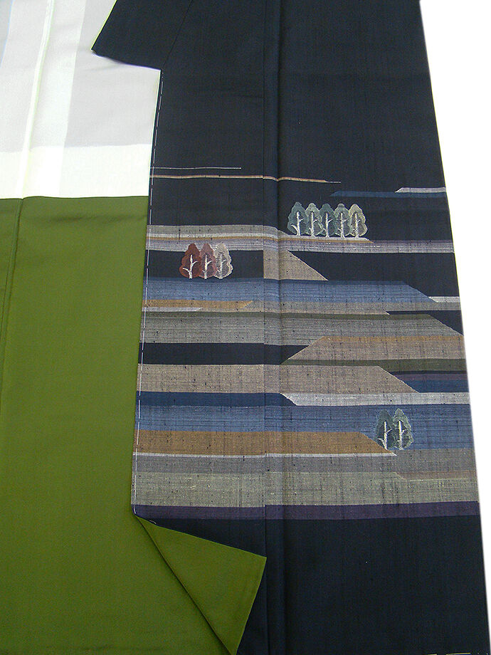 | 商品説明 | こちらのお品は「袷」ですので10月から5月までお召頂ければと思います。 とてもしなやかで柔らかな手触りの紬地、着易く動きも軽く、着くずれしない腰の強さを 併せ持ったお洒落着としていつでもどこへでもお気軽にお愉しみ頂けご愛用頂けるお品です。 黒色地に灰、藍鼠、草、茶色等の横段に立木柄の織柄、 八掛は抹茶色(正絹)、幅広い年代の方にお召頂けるでしょう。 |