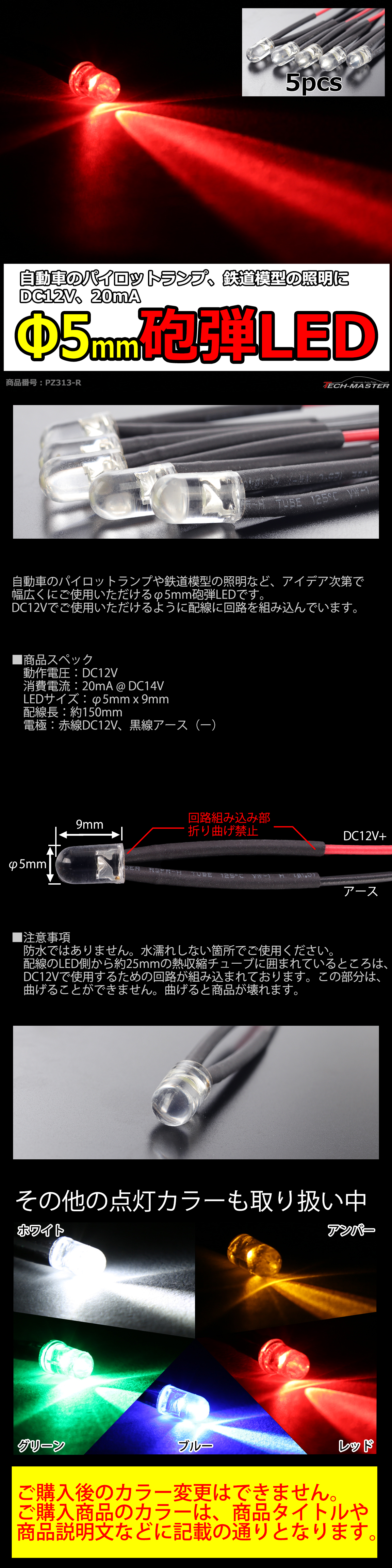 | φ5mm砲弾LED 5本セット 数量:1セット5本 対応電圧:DC12V 消費電流:20mA @ DC14V 点灯色:レッド LEDサイズ:φ5mm×9mm 配線長:約150mm 電極:赤線DC12V、黒線アース(ー) |