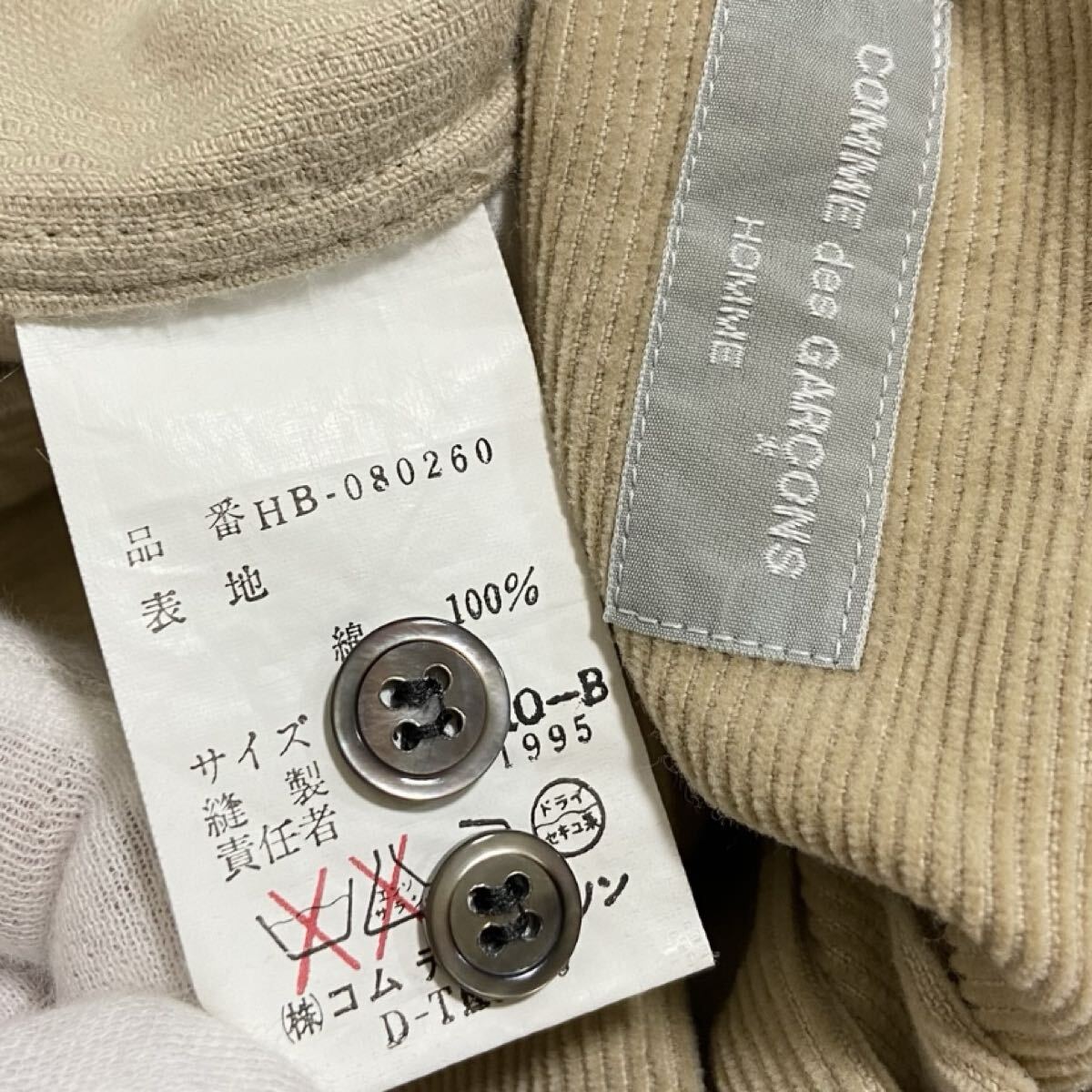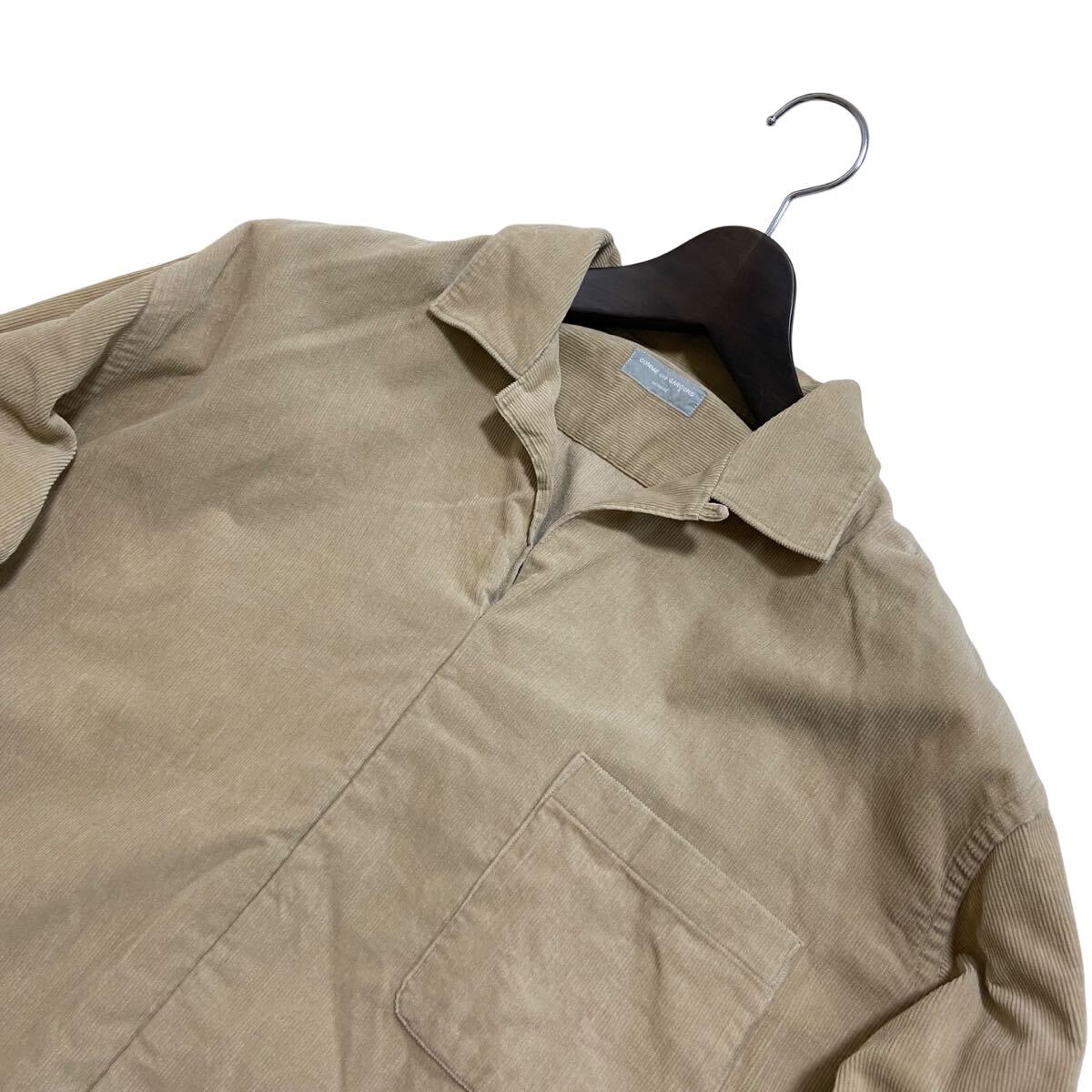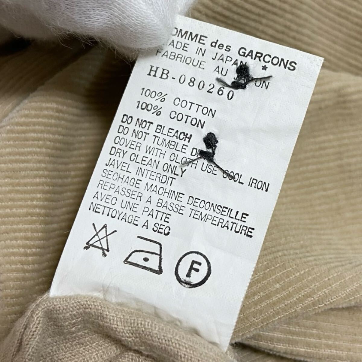 コムデギャルソン オムのコーデュロイカバーオールジャケット。希少なAD1995。選び抜かれたコットンを贅沢に。世界観に溺れることができる個性的ワイドシルエット。洗練されたシルエットと芸術的なひねりが効いたアイテム。クリエイティビティとクラシックエレガンスの融合。サイズ表記はありませんのでメンズフリーとして。カラーはライトベージュ系。日本製。国内正規品。プルオーバータイプ。フロントスリット入り。両サイドにオープンポケット。