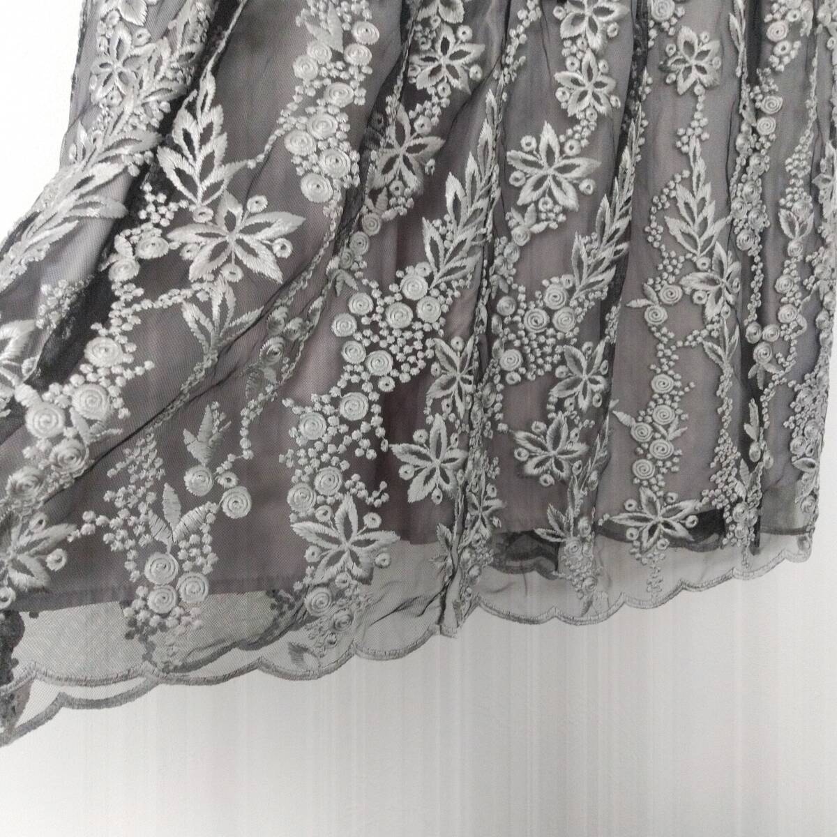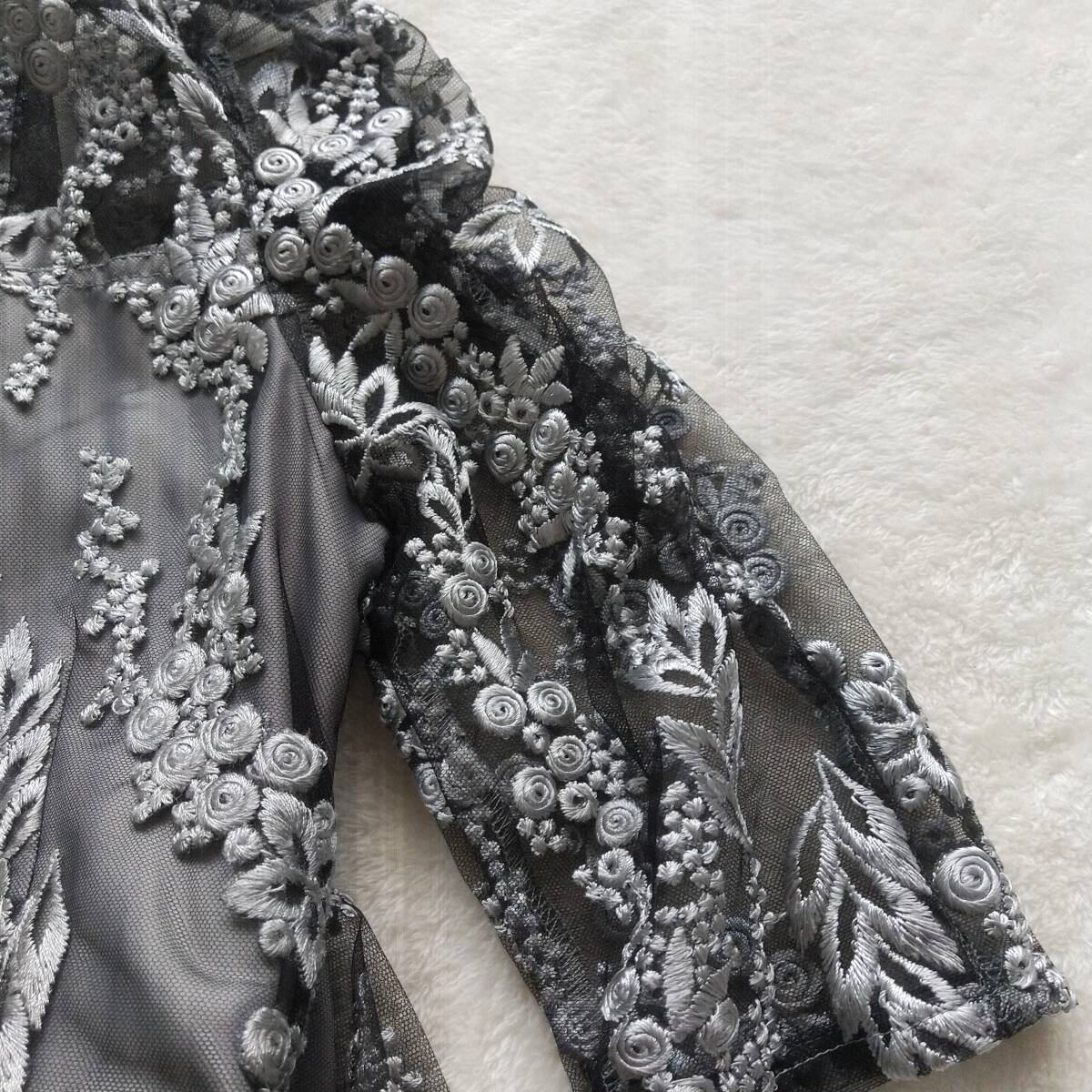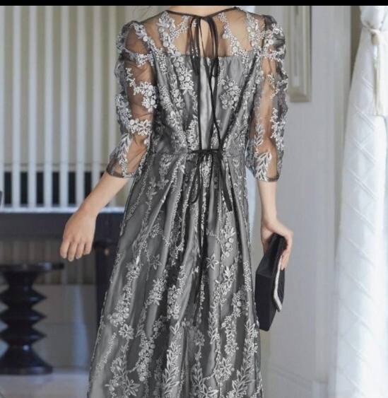 華やかな刺繍レースと、後ろ姿を美しく見せるバックリボンがポイント。結婚式やパーティー、特別なお食事会などフォーマルシーンにぴったりの一着です。