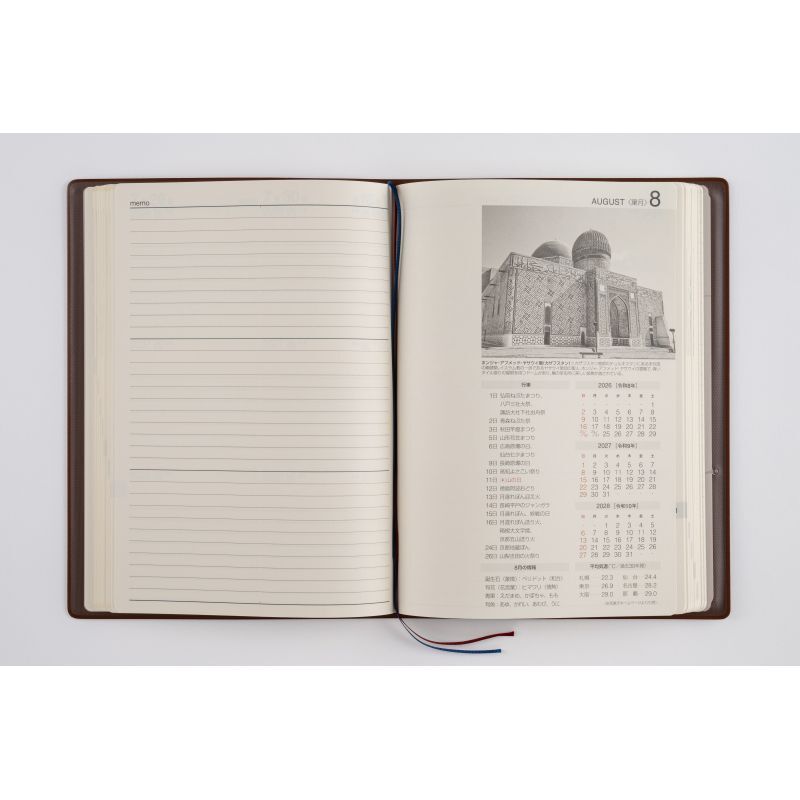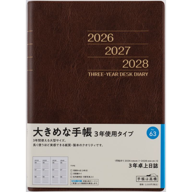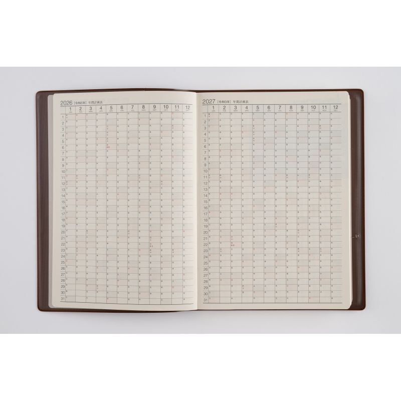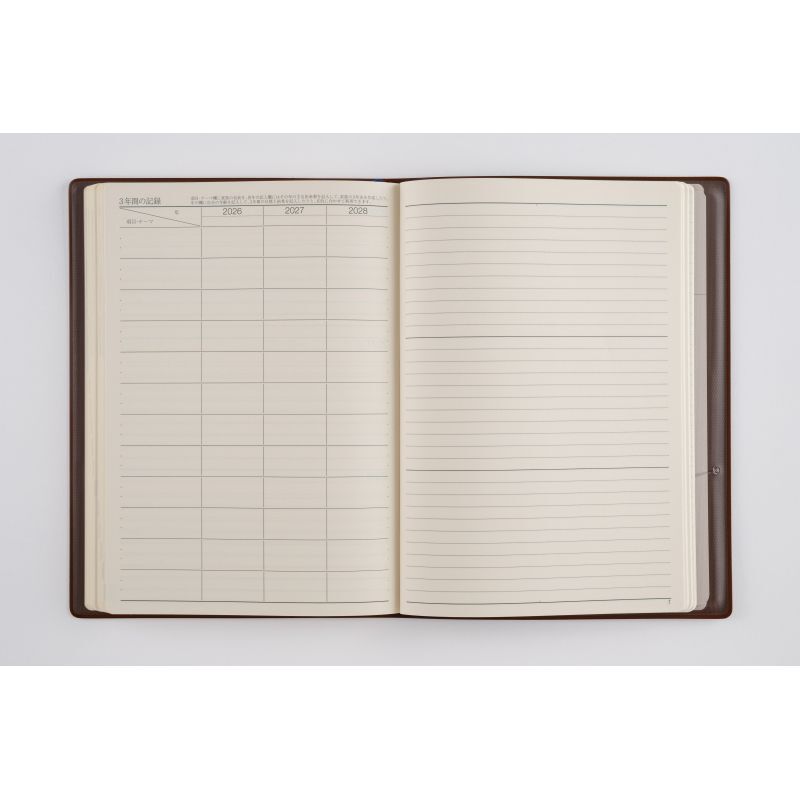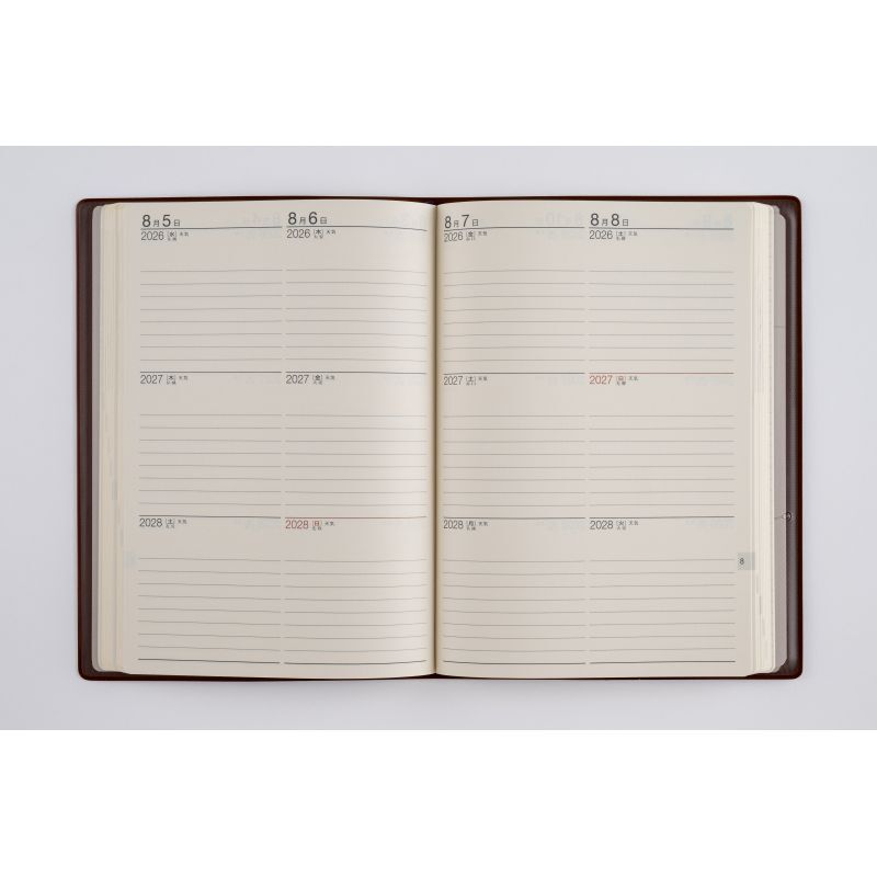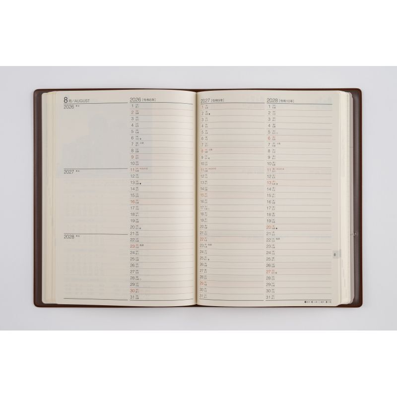3年分の記録を書き込める連用ダイアリー。横ケイ式の月間ページは3年分の予定が一覧でき、ビジネスや年間行事などの管理に役立つ一冊です。シックなブラウンのカバーは、ビジネスにもプライベートにも。