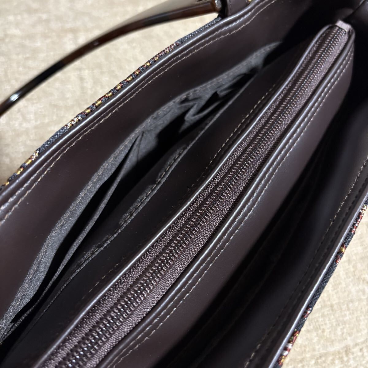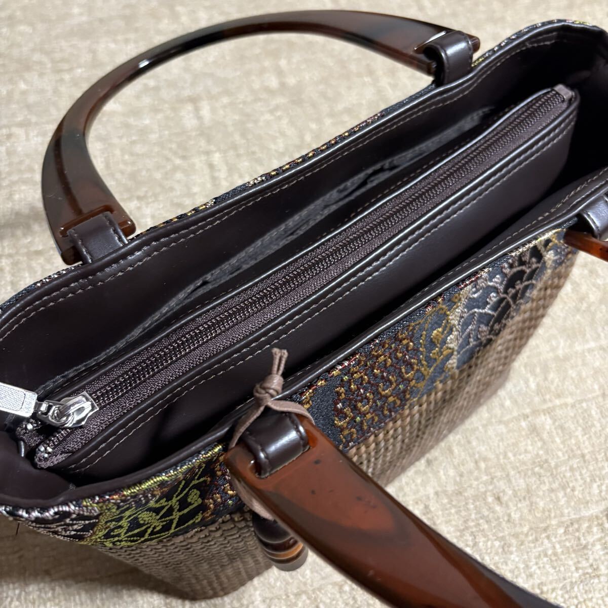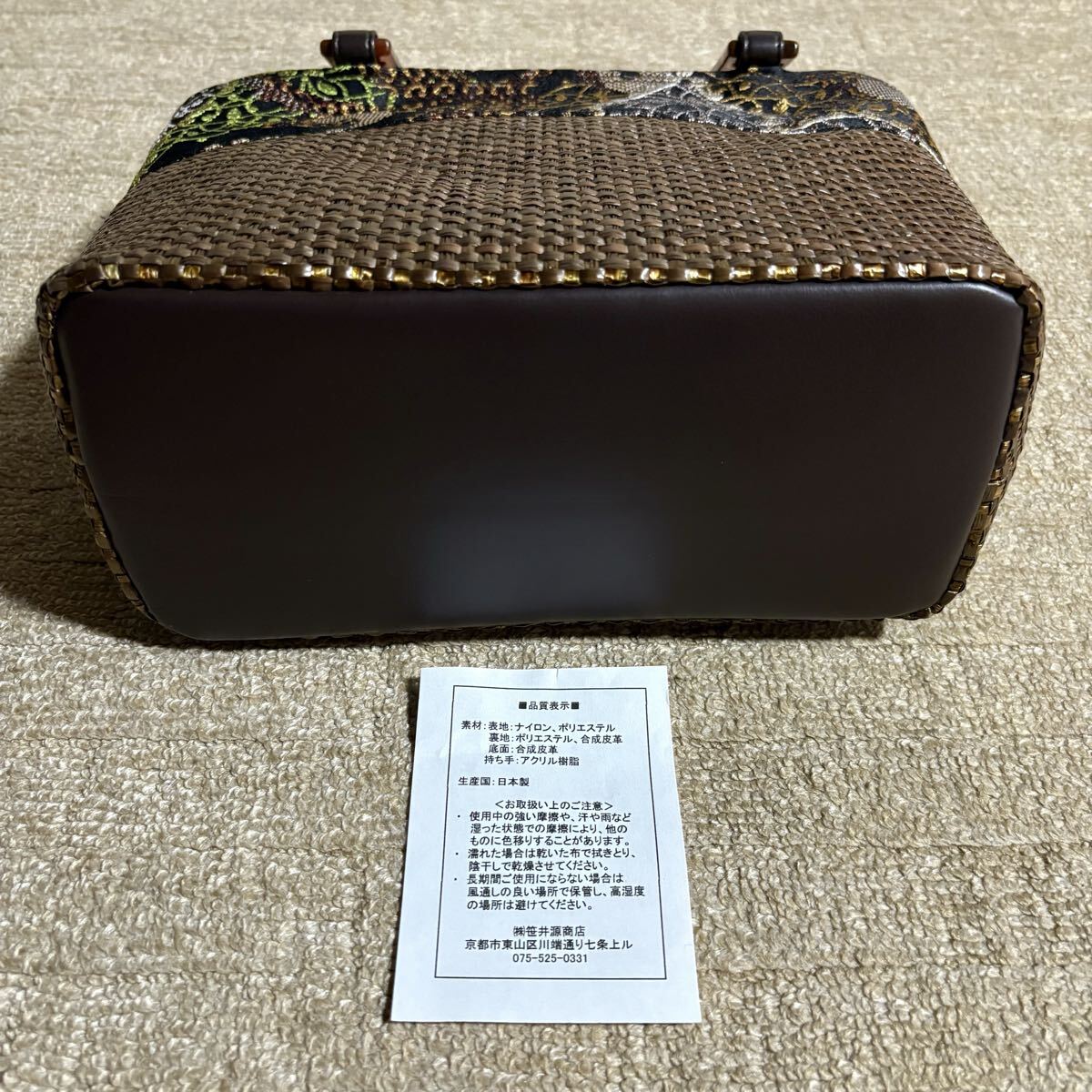 緻密な織りのトルコ製ゴブラン生地とムラ染のパナマ編み生地との切替デザインに創業明治35年の京都の老舗「笹井源商店」で職人が1点1点丁寧に作り上げたバッグ。
