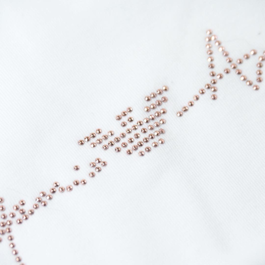 胸元のロゴはローズゴールドのラインストーンで上品にあしらい、控えめながらも確かな存在感を演出します。