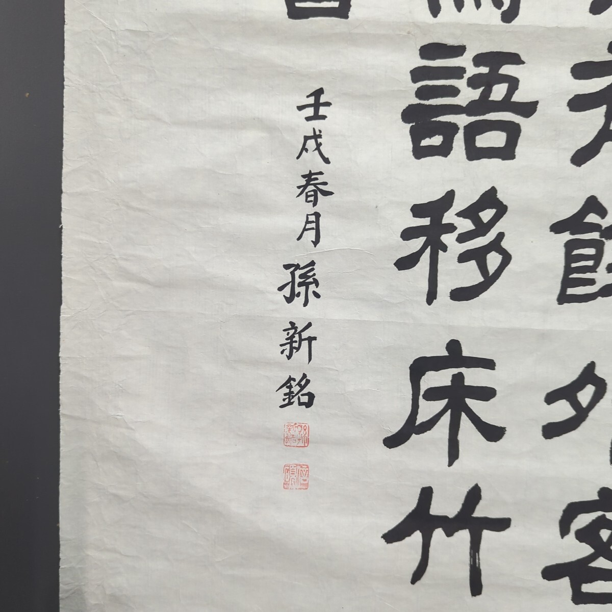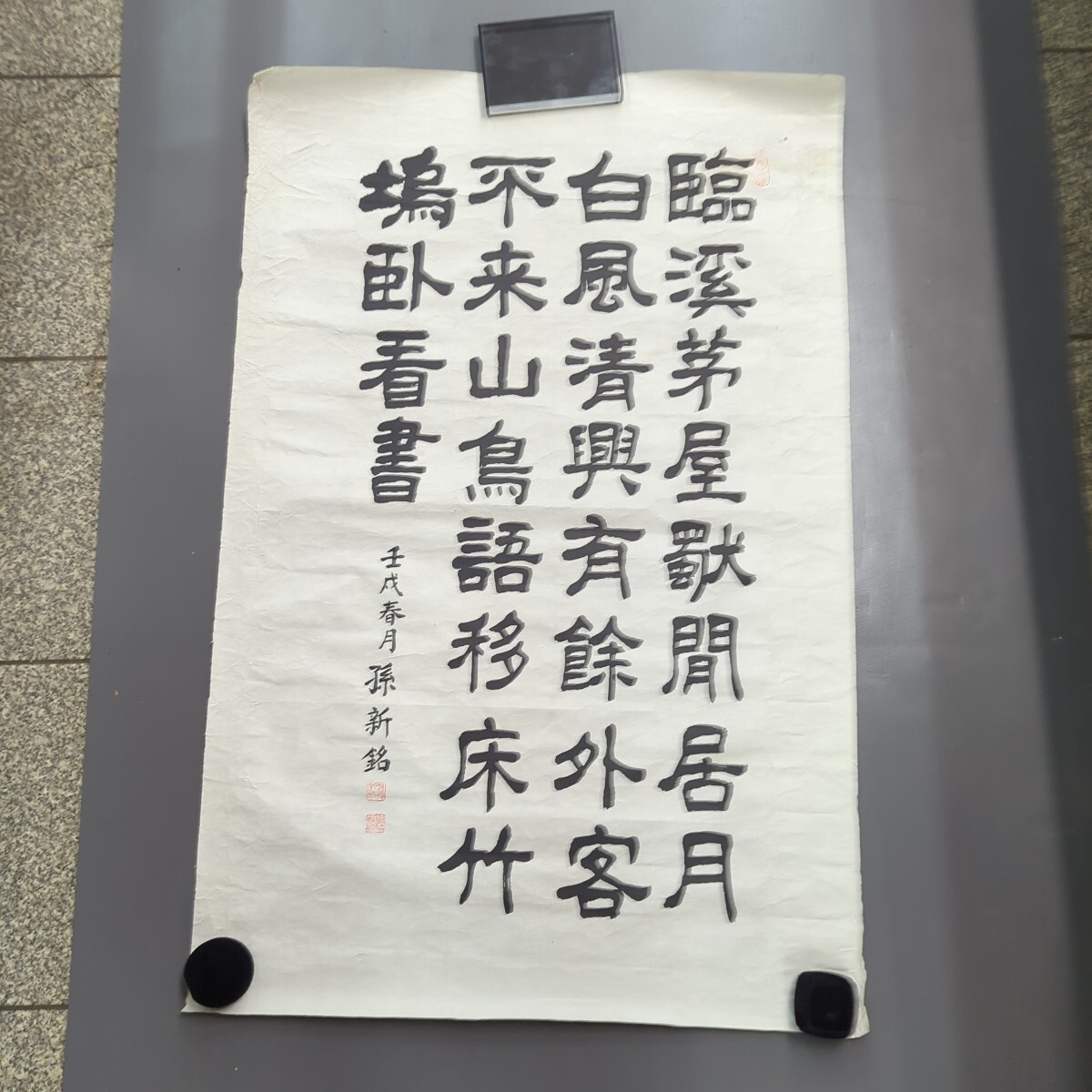 孫新銘の隷書作品、隷書ならではの趣きのある筆。渓流のほとりの茅葺きの家で月を眺める、鳥のさえずりを聴きながら書物を読む漢詩の隷書