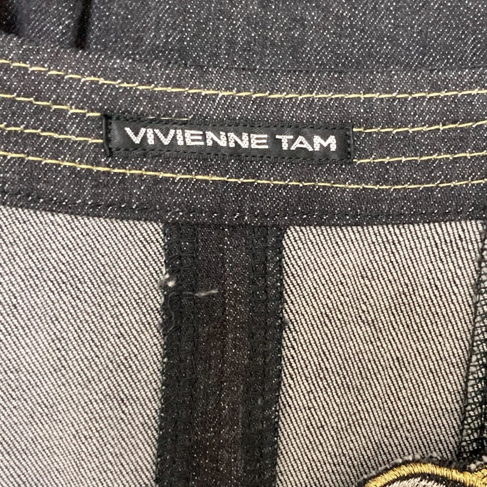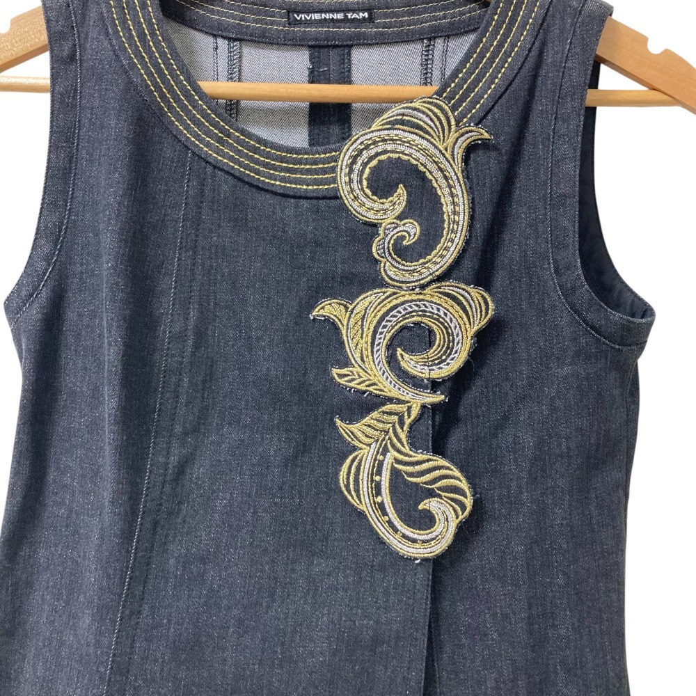 美品 VIVIENNE TAM ヴィヴィアンタム 刺 ノースリーブ ひざ丈 Aライン デニムワンピース サイズ0 ブラック