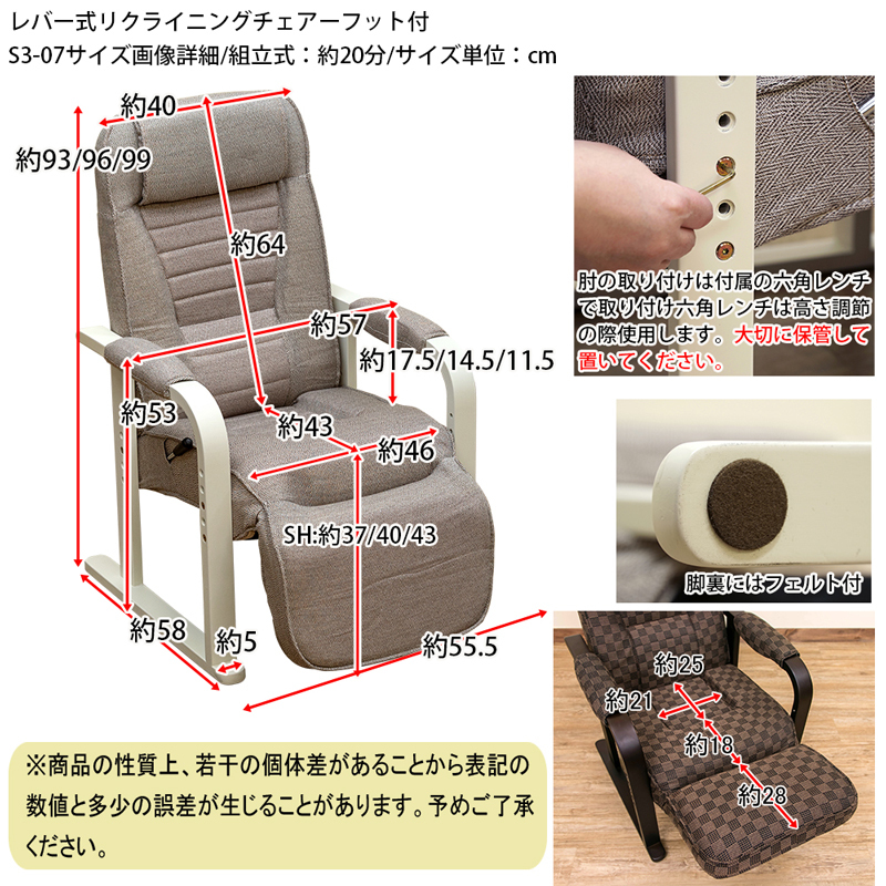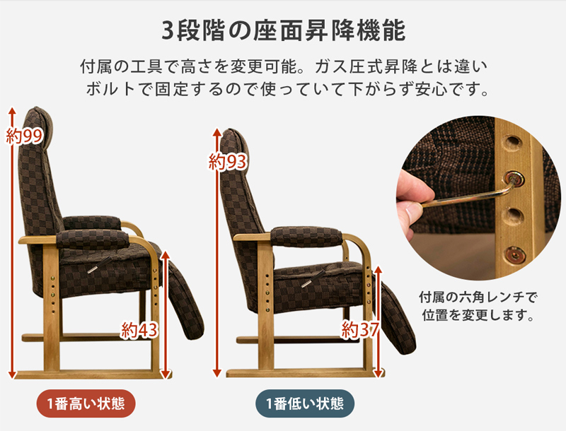 | 商品説明 | 組立品(約10分) 脚までゆったりリラックス♪ 背もたれ無段階リクライニングの高座椅子です! 背もたれ13段階、脚は5段階のリクライニングでゆったりリラックス! 安定感のあるリクライニングチェアーです。 座椅子の高さ調節は3段階の高さからお選び頂けます! 立ち上がる時に便利な肘掛けで楽々です。 |