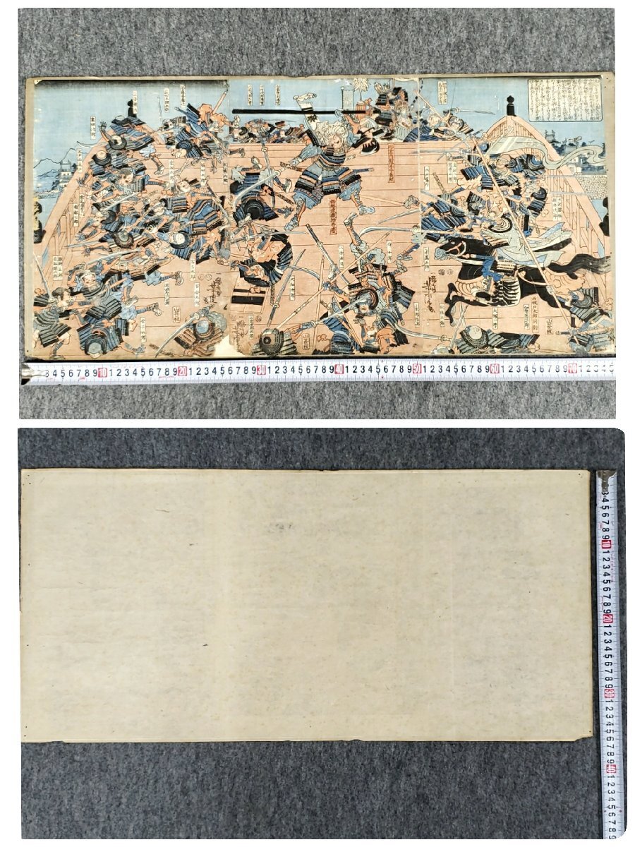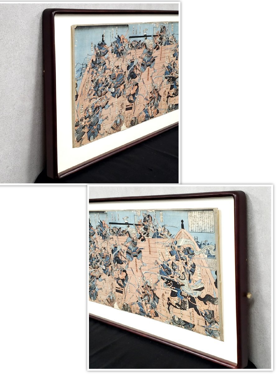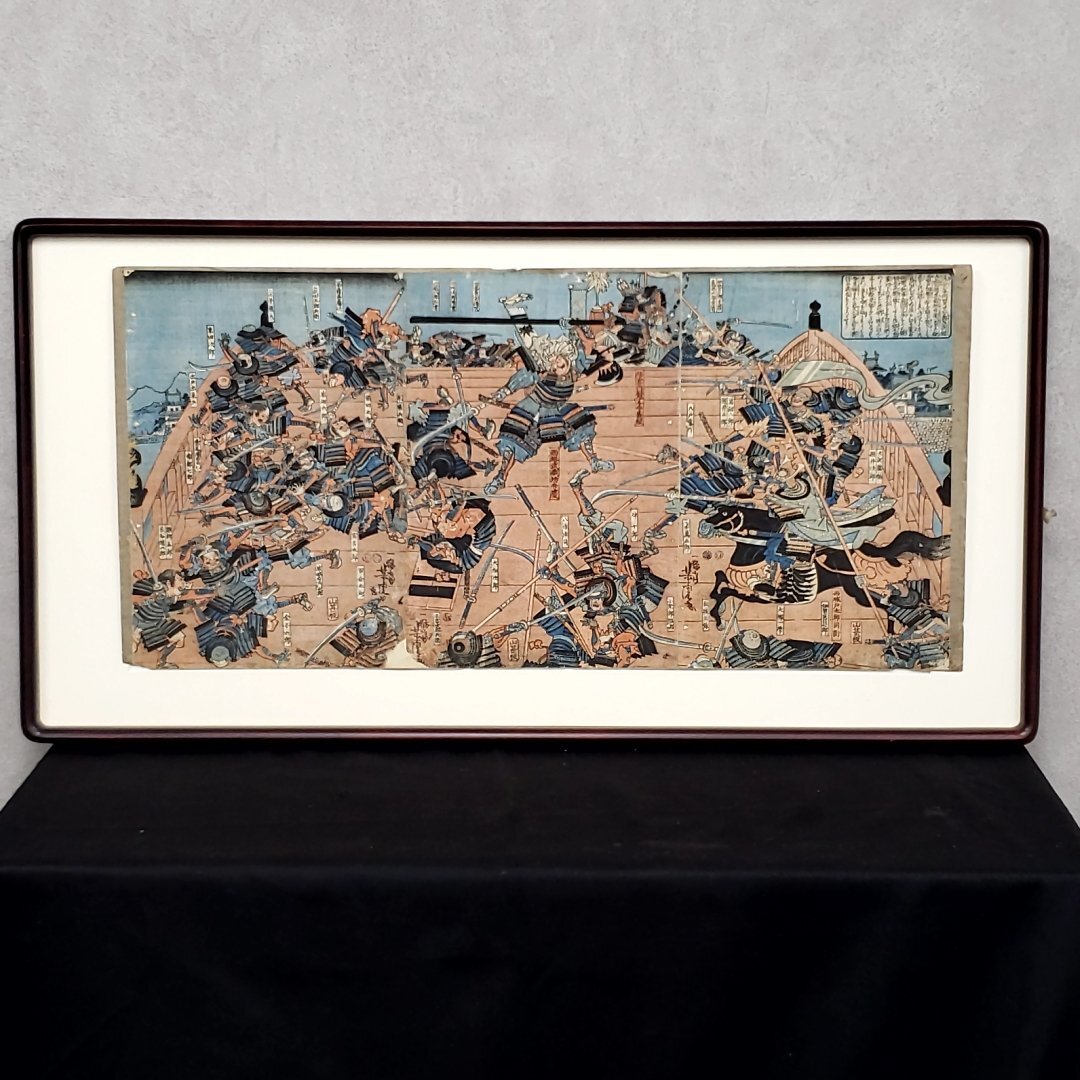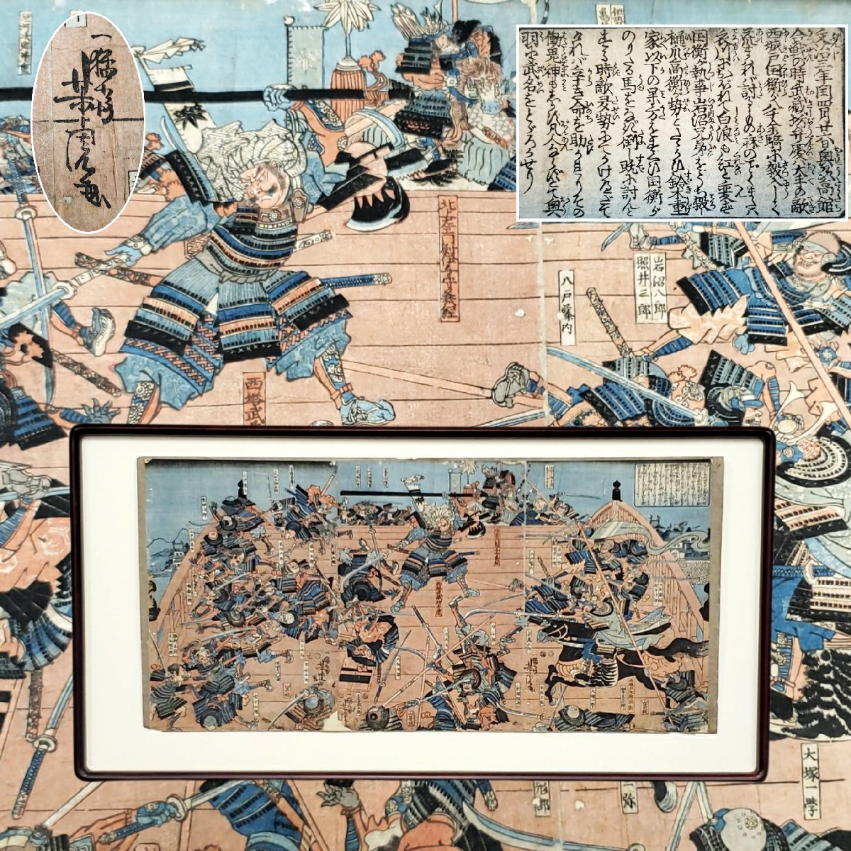 | 商品名 | 武者絵 歌川国芳 ?大判木版画 浮世絵 木版画 奥州高館城大合戦之図 錦絵 3枚 國芳 文治 安政 奥州藤原氏 源氏 歴史 資料 額装 | ||||||||||||