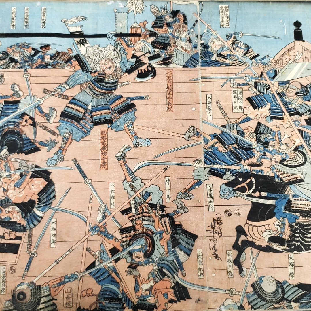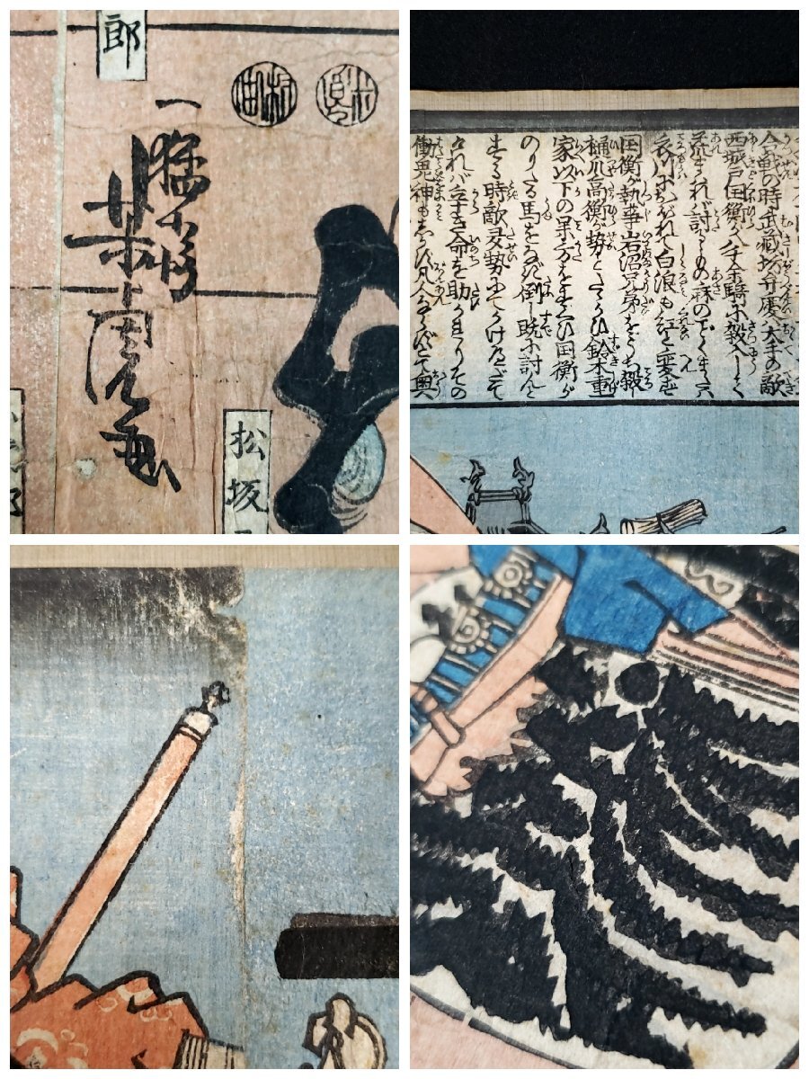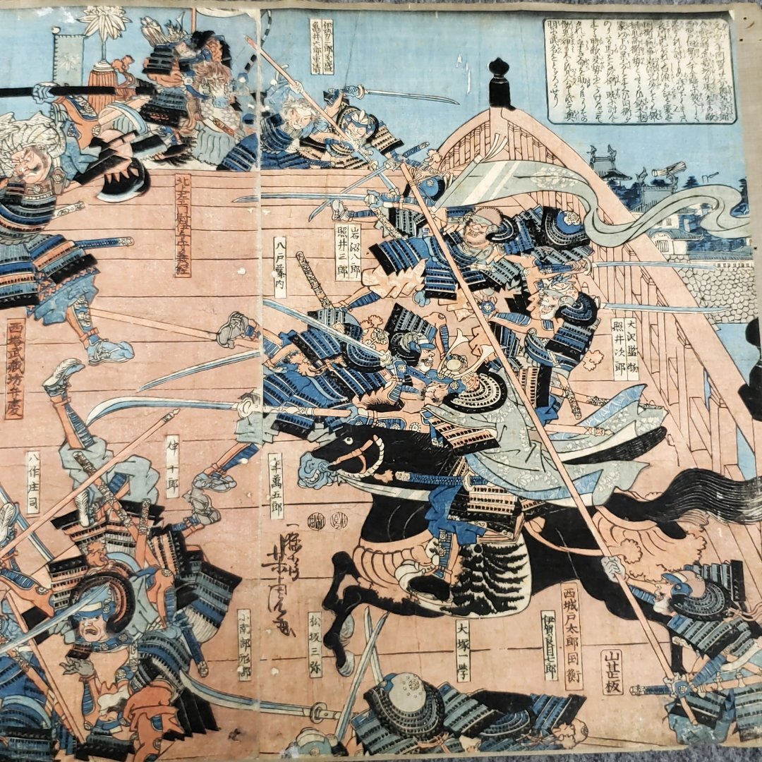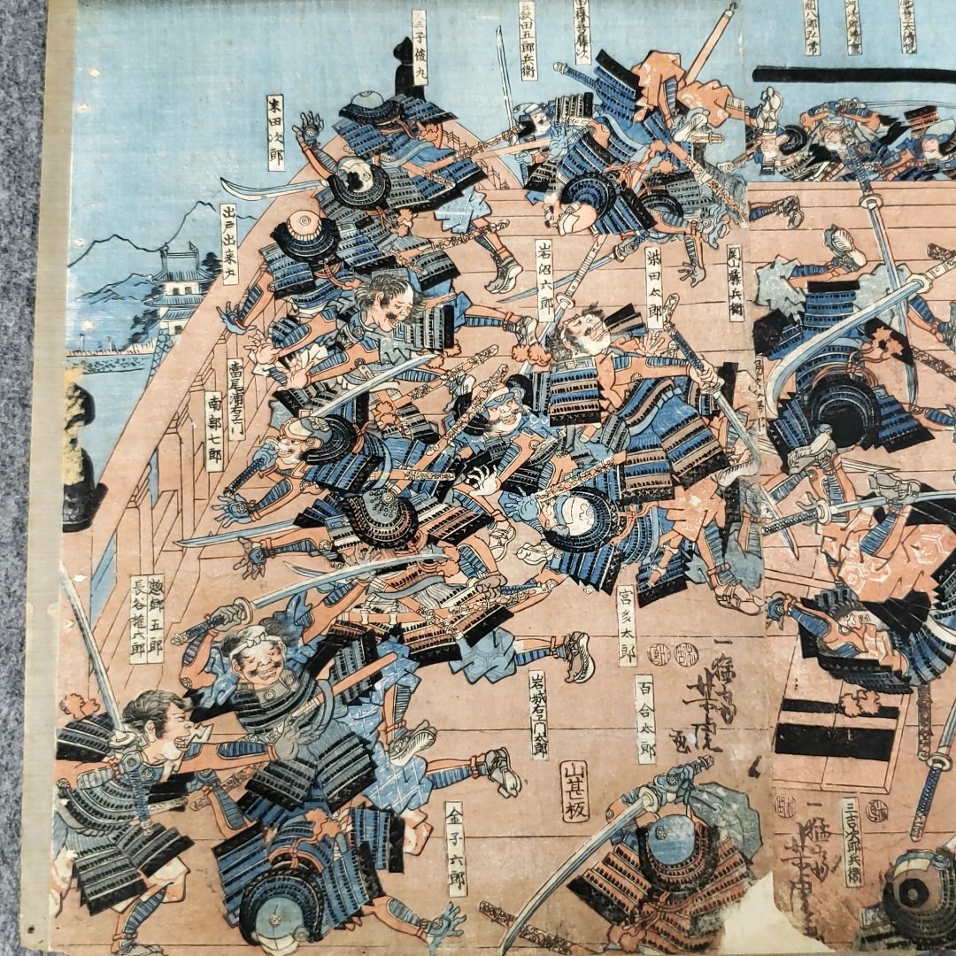 | 商品名 | 武者絵 歌川国芳 ?大判木版画 浮世絵 木版画 奥州高館城大合戦之図 錦絵 3枚 國芳 文治 安政 奥州藤原氏 源氏 歴史 資料 額装 | ||||||||||||