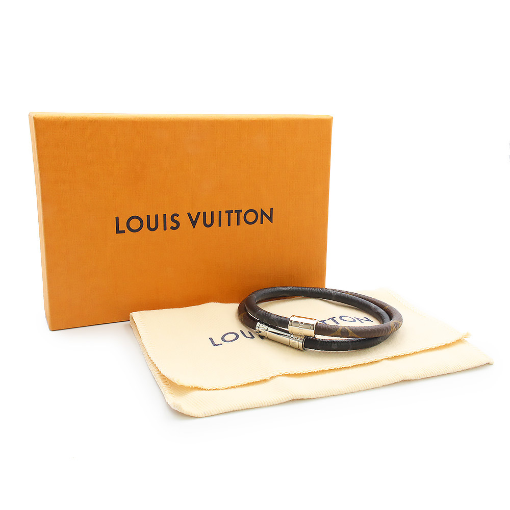 アイコニックなモノグラム・エクリプス キャンバスとモノグラム・マカサー キャンバスの組み合わせが、レイヤード効果を演出する「ブレスレット・キープ イット」。「Keep it」の名に相応しく、シルバーカラーのユニークなクラスプが採用され、2重巻きのスタイルがインパクトのあるデザインです。「Louis Vuitton」シグネチャーの刻印がスタイリッシュな雰囲気を放ちます。