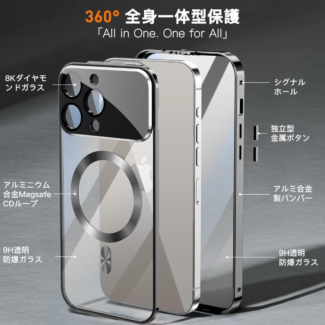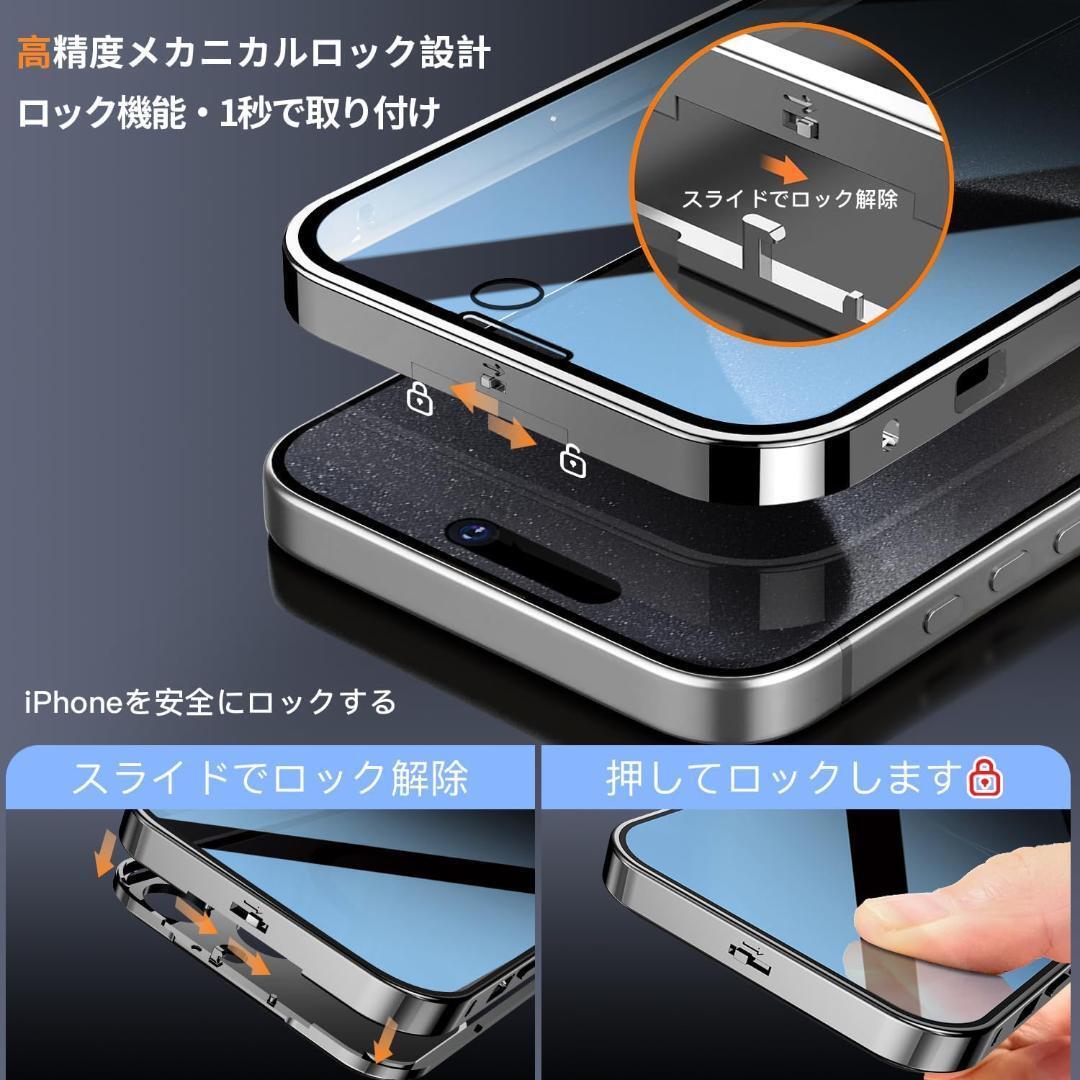 このiPhone 15 Proケースの上部には高精度のメカニカルロックが搭載されており、1回のスライドで1秒でロック/ロック解除が可能です。ケースの両面は硬度9hの強化ガラス製です、側面には高品質の航空アルミ合金製を採用した高級感のある作り。前面、背面、側面、レンズをカバーできます。