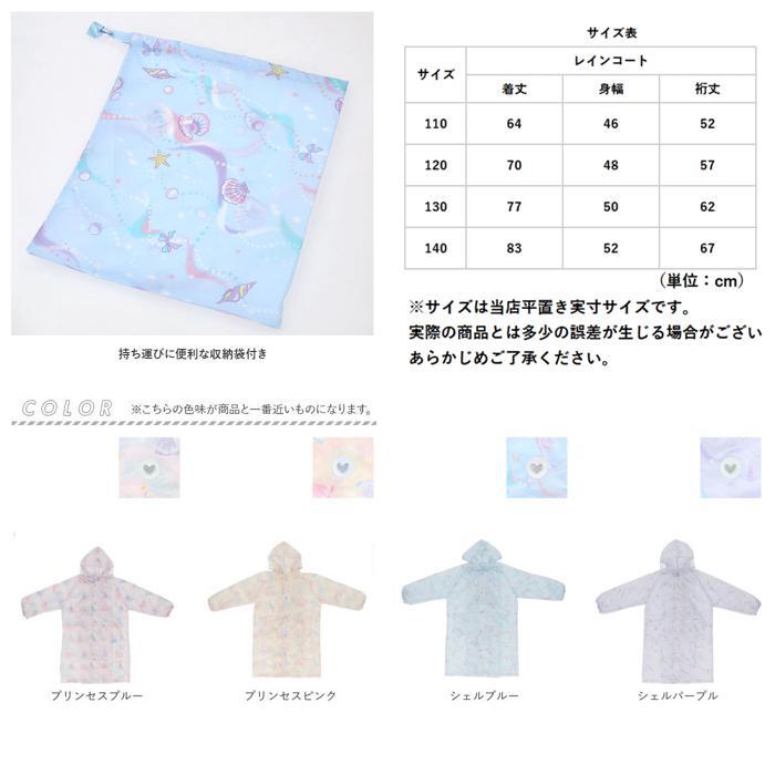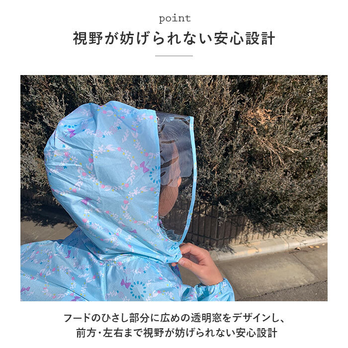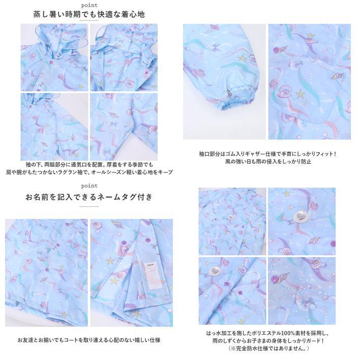 商品説明 | ・・パステル調のポップな色使いがとってもキュート♪ランドセルの上から羽織れるキッズレインコート(女の子用)が新登場! ・軽い着心地のコート生地にははっ水加工を施したポリエステル100%素材を採用し、雨のしずくからお子さまの身体をしっかりガード!(※完全防水仕様ではありません。) ・フードのひさし部分に広めの透明窓をデザインし、前方・左右まで視野が妨げられない安心設計。 ・コート背中には、スナップボタンを外して広がる「ランドセルタック」付き。ランドセルやリュックを背負ったままでもすっぽりと着用可能。 ・自動車のライトにピカッと光る☆背中のタック部分にはハートやアニマルモチーフのリフレクター素材が付いているので、薄暗い雨の日でも安心♪ ・前合わせは、お子さまご自身でパチンッと簡単に留められるスナップボタンタイプ。 ・袖口部分はゴム入りギャザー仕様で手首にしっかりフィット!風の強い日も雨の侵入をしっかり防止。 ・袖の下、両脇部分に蒸し暑い時期でも快適な通気口を配置。さらに、厚着をする季節でも肩や腕がもたつかないラグラン袖のデザインにすることで、オールシーズン軽い着心地をキープ。 ・前開き裏側部分にはお名前を記入できるネームタグ付き。お友達とお揃いでもコートを取り違える心配のない嬉しい仕様。 ・プリンセスや貝殻のモチーフをパステルタッチで描きだした、オシャレなガールズにオススメのゆめかわデザイン。持ち運びに便利な収納袋付き。 |