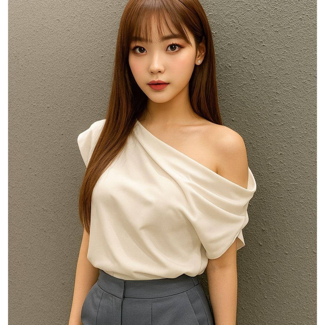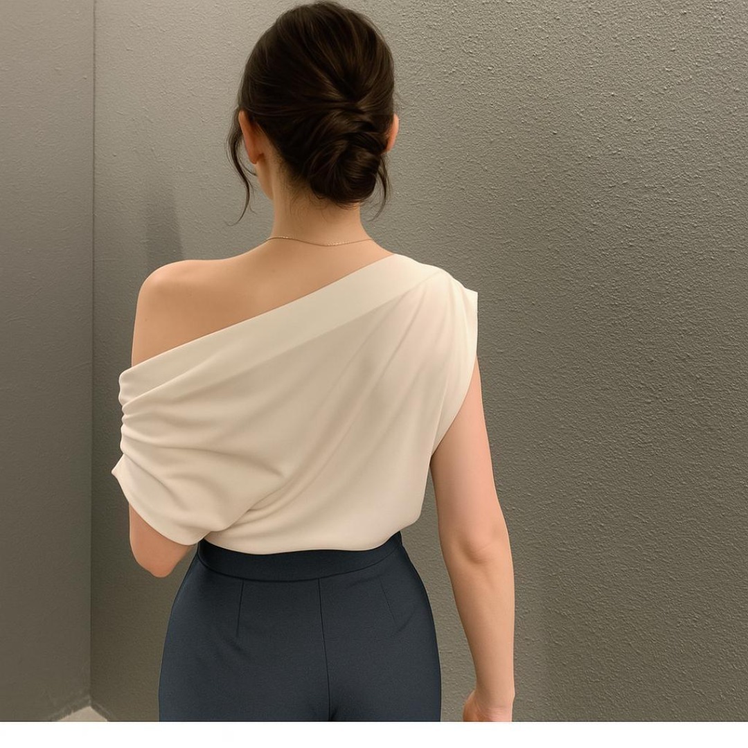 - エレガントなドレープネックで大人の肩見せを演出