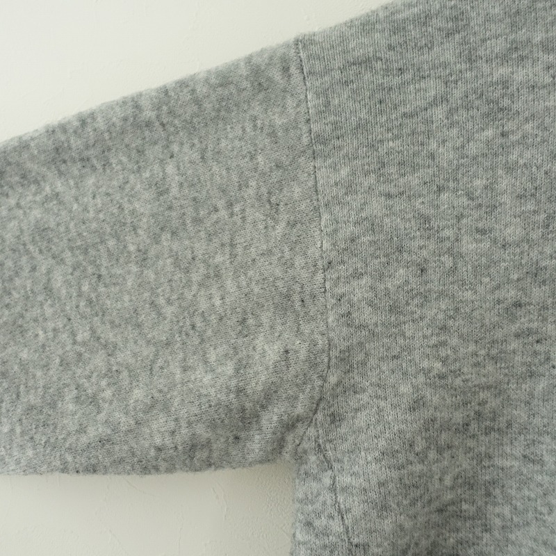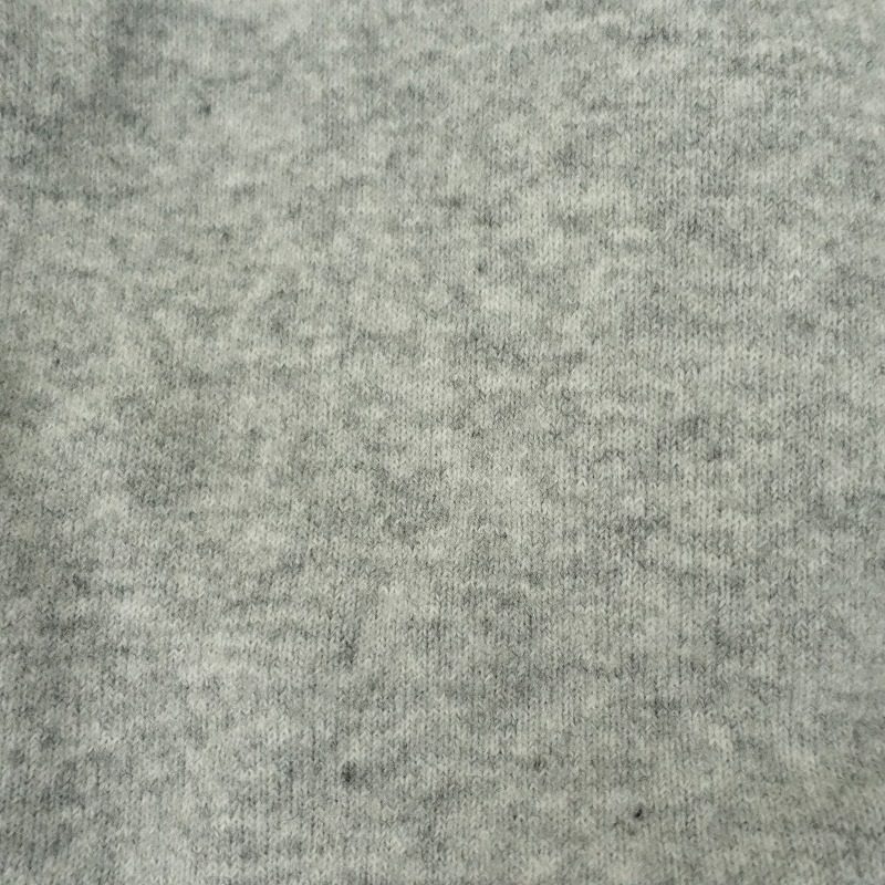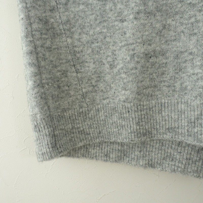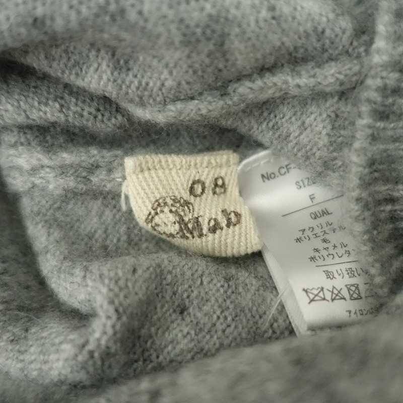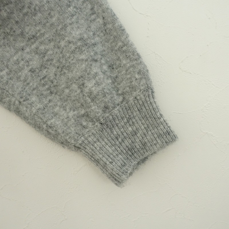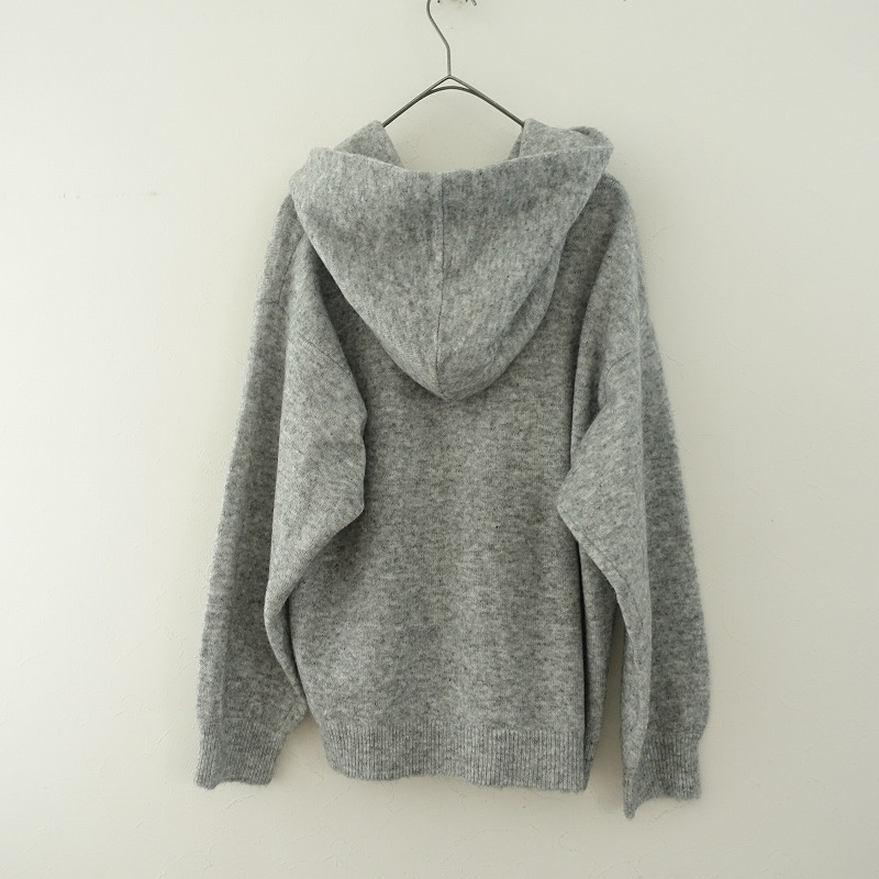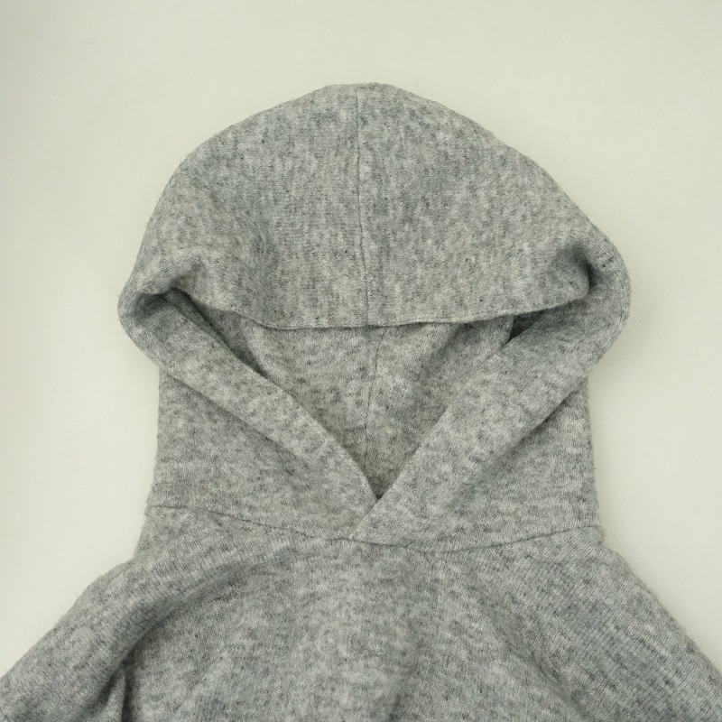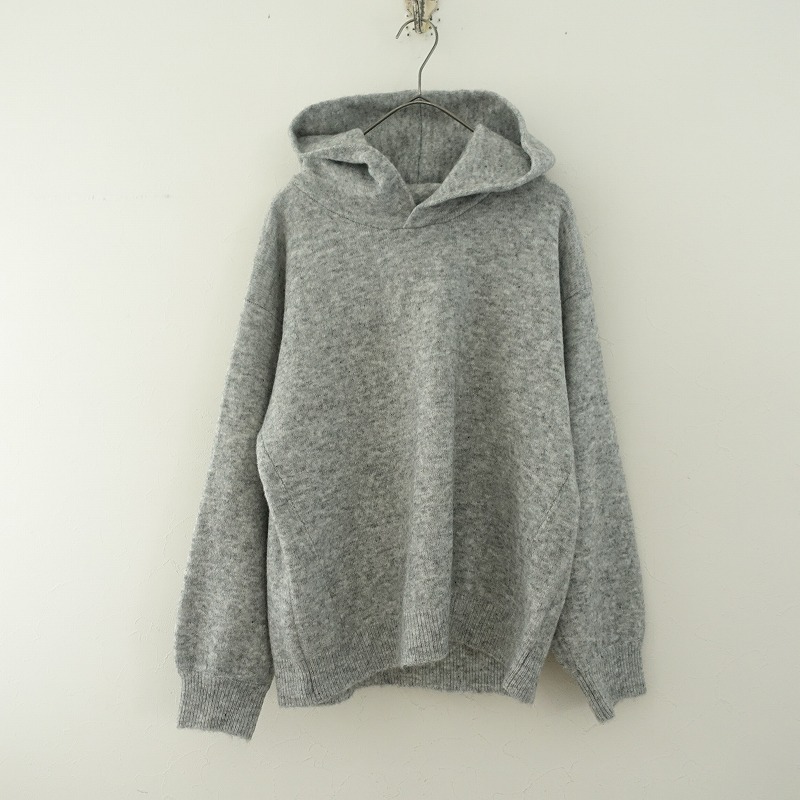 | 08 Mabのフード付きニットプルオーバーです。カラーはミックスグレーで、毛×キャメルなど混紡の柔らかな起毛ニット地です。プルオーバータイプで着脱でき、袖口・裾はリブ編みで、フード部分は2枚仕立てです。 |
