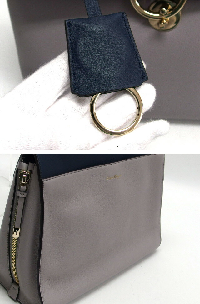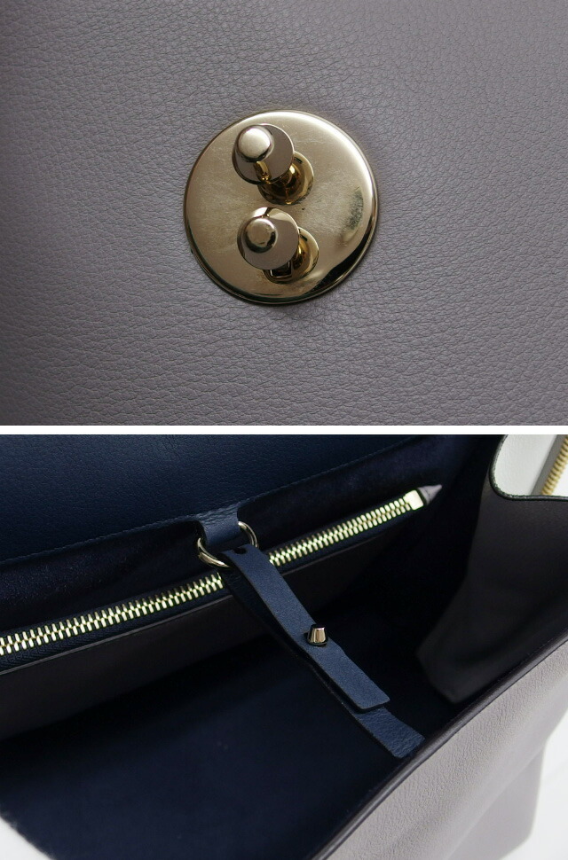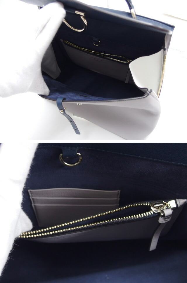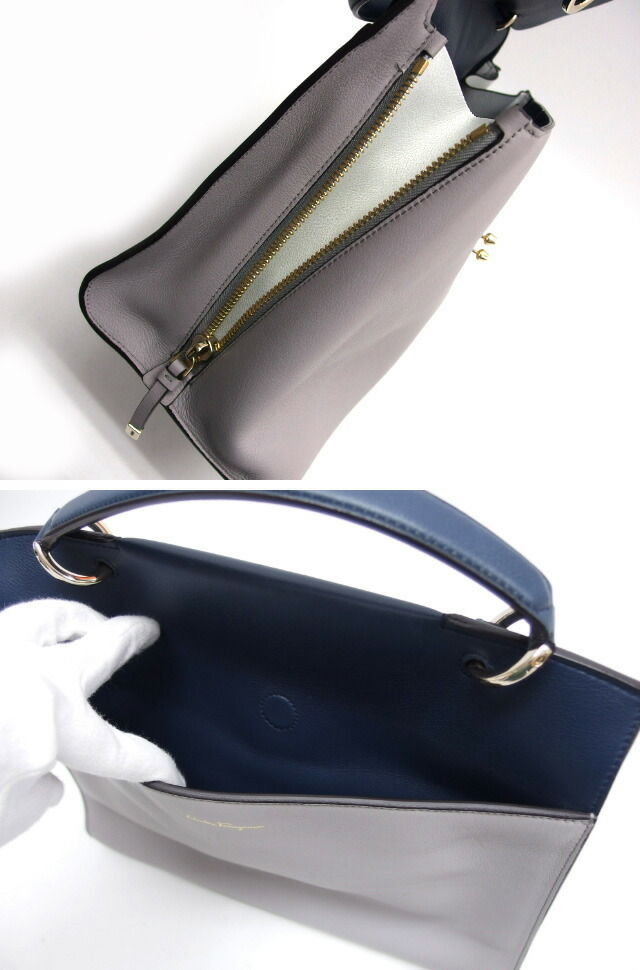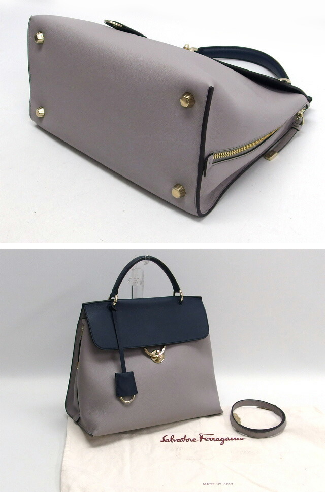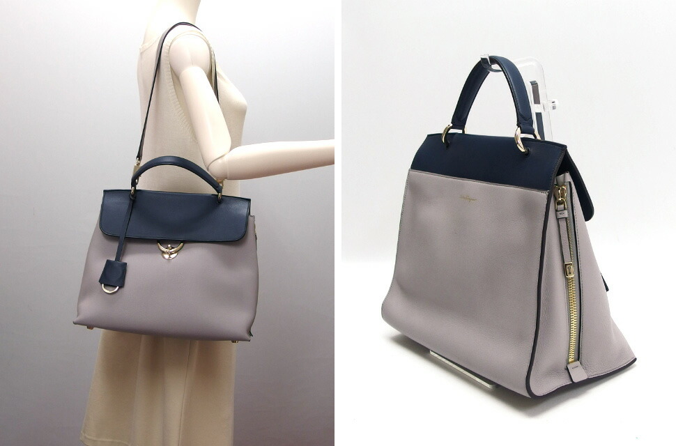 商品名 | ジェットセット 2WAY バイカラー ハンドバッグ ショルダーバッグ トップハンドル レザー グレー ネイビー(紺) フラップ開閉(金具式) ベルト付き サイドファスナー ガンチーニ金具 ショルダーストラップ(着脱可能) 肩掛け レディース DY-21 G849 |