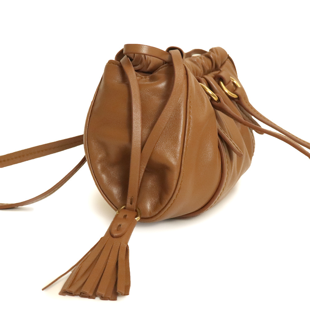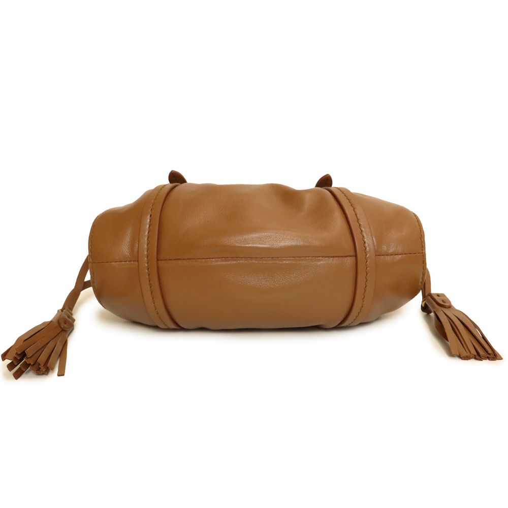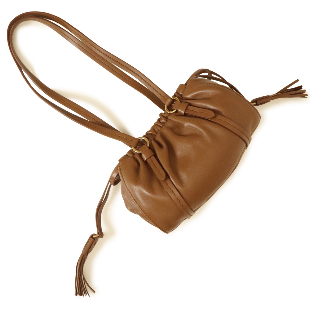 柔らかなナッパレザー素材で、上部はギャザー仕様。サイドにはタッセル付きペンダントあり。ゴールドトーンのロゴレタリングがフロントに配置。ハンドルは、手持ちでも肩掛けでも使用可能。