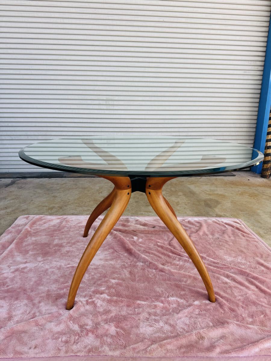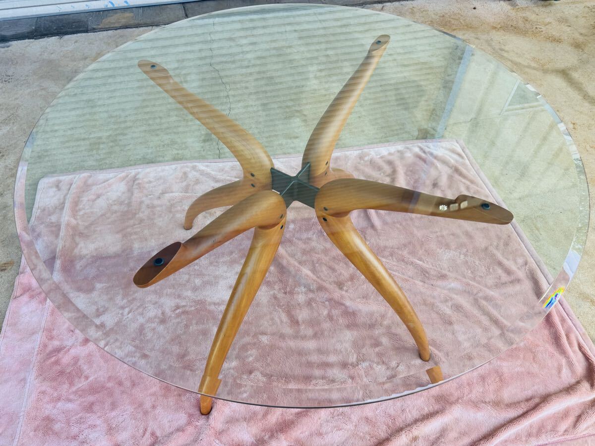 ガラスの無機質な質感と有機的な曲線を描く削り出しの木製脚の対比が洗練された美しさを湛えます。天板縁は大きくカットされた縁取りで、ガラス全体に上質感が生まれるデザインです。