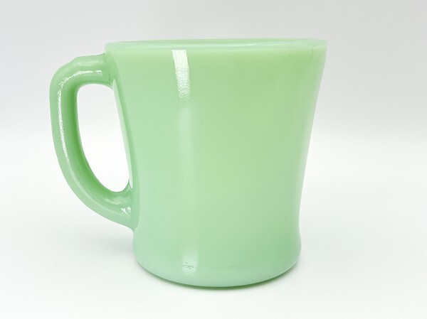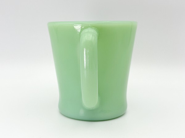 ■商品説明:ファイヤーキングのジェダイ・Dハンドルマグです。 ハンドルの形が「D」に似ていることからこう呼ばれています。 ファイヤーキングといえば「これ」ってくらい、シンボル的なアイテムです。 使いやすいデザイン、なんともいえない翡翠色と、コーヒーを入れた時の透け感。 長く使えるマグです。 こちらはハンドルが太いタイプです。 ■コンディション:★★★★☆【エクセレント~ニアミント】 ■サイズ:横幅10.4cm、直径8.2cm、高さ8.5cm ■刻印:OVEN Fire-King WARE MADE IN USA