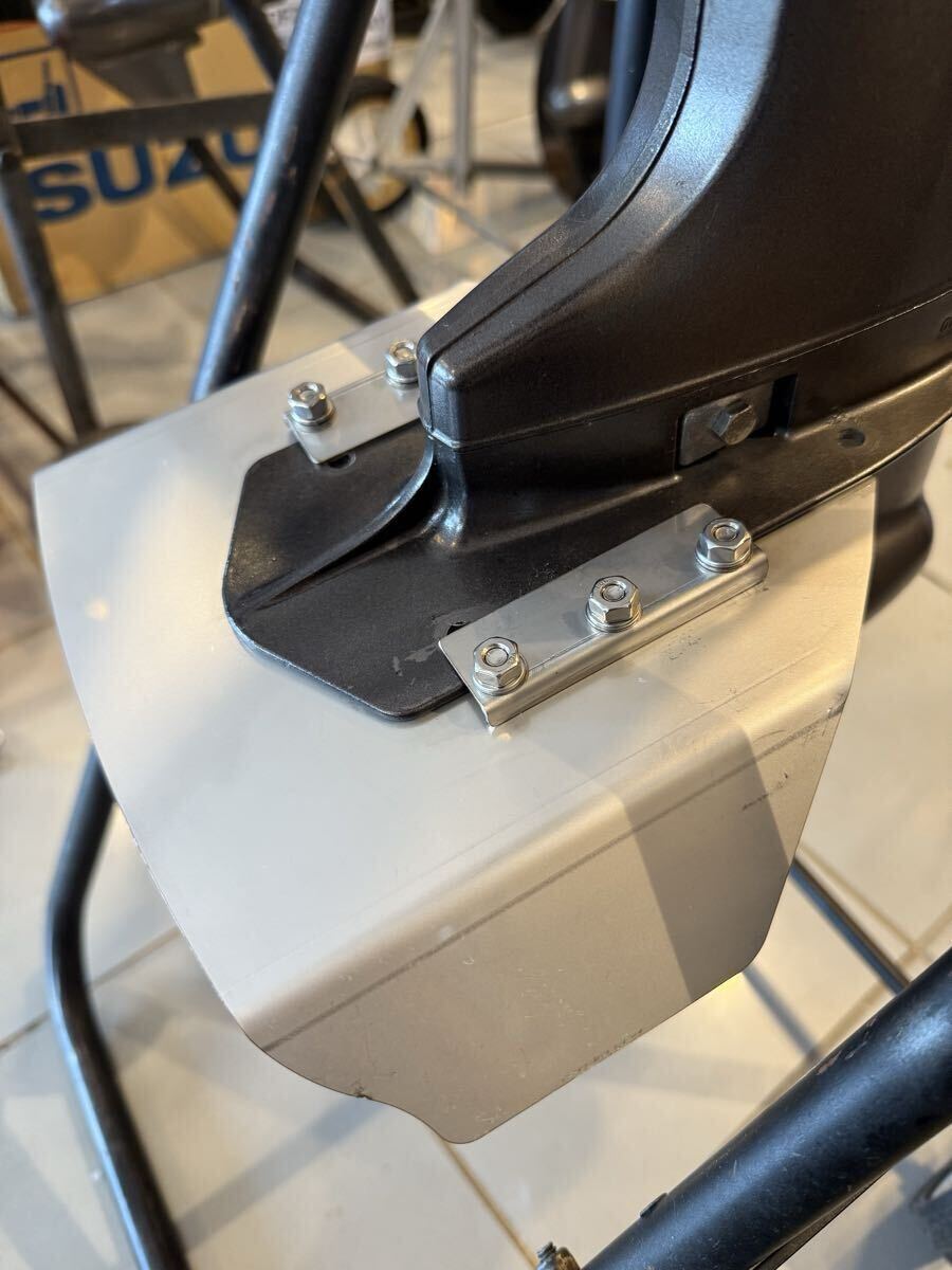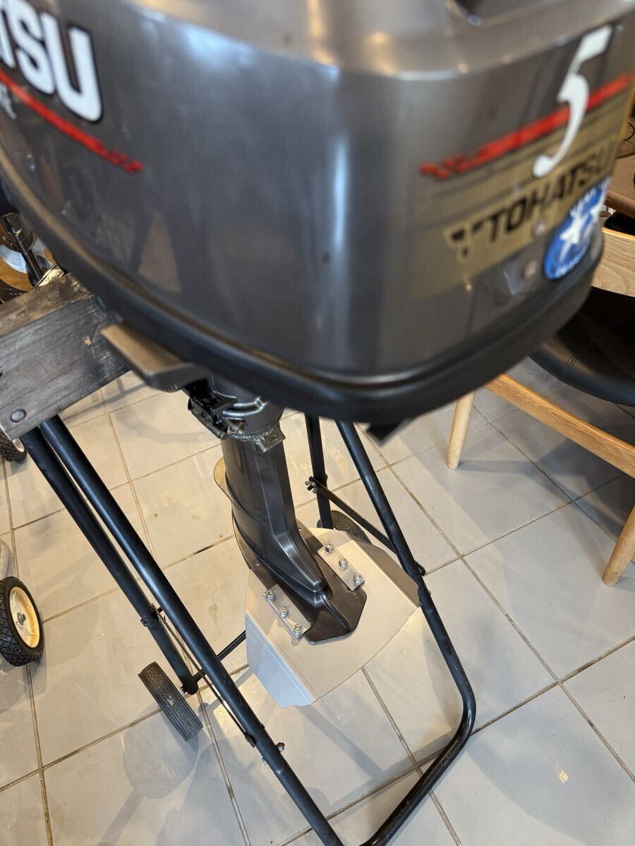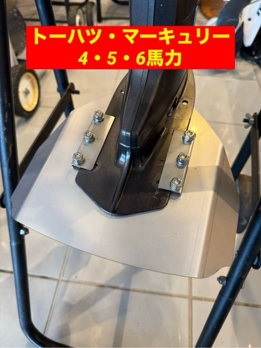 | トーハツ・マーキュリー 4馬力・5馬力・6馬力 2ストローク・4ストローク船外機 スタビライザー トーハツ・マーキュリー4馬力・5馬力・6馬力 2ストローク・4ストロークどちらでも船外機本体の加工無しで取付出来ます。 2馬力用よりも大きめになります。 ★注意★ 1.5㎜厚のコピー商品に注意して下さい。 必ず曲がります。 海で使用する場合、水中では波の影響でスタビライザーに上下に働く大きな力が連続的に掛かります その影響で1.5㎜だと本体及び取付プレートが曲がり 取付にガタが出て気付かない内に脱落してしまいます。 その他にも1.5㎜だと薄い為、ネジ山が締め付けトルクに負けて潰れてしまいます。 【スタビライザーの効果】 滑走(プレーニング)というのは物体を支えるのに浮力よりはるかに大きな揚力が作用して航走している状態をいいます。 船底に働く揚力によって艇体が持ち上げられ、滑走状態になるとバウが下がり水に対して3°~5°のトリム角(縦傾斜)で水面を滑るように走行するのが特徴です。 よってスタビライザーも3°~5°のトリム角で常に裏面に働く揚力が発生します。 それによって船外機が持ち上げられ滑走状態により早く持ち込みます。 様々な形状のスタビライザーでテストしましたが、格好良いのですが、スタビライザーの左右を平行90°曲げてしまうと、スタビライザー裏面に当たった水の逃げ場が分散されず後方だけになり、滑走状態時に流速が追いつかず滞留してしまい、スタビライザーの揚力が落ちてしまいプレーニング効果が落ちる傾向にあります。 強度を保つのにスタビライザー本体の曲げは必要です。 強度を保つ最低限の折曲げで、尚且つ後方に水が流れ易くなる様、曲げ加工を施し流速を確保しプレーニング効果が落ちない様、本製品は設計されてます。 是非、本スタビライザーの効果を体感してみて下さい。 滑走状態が長い程、燃費もかなり良くなります。 材質:SUS304(ステンレス) 2B材使用 2.0mm レーザーカット後折り曲げ加工 塩害(サビ)に強く、曲げ加工により強度は抜群です。 船外機を横置きした場合もペラを保護してくれます。 (海水にて使用しましたが全くサビません) 船外機への加工(穴明け)等は船外機本体の塗装が剥がれ腐食の原因となりますが、本製品は無加工で取り付け可能ですので腐食の心配はありません。 取付はキャビテーションプレートを挟み込む様に取り付けて下さい。取付位置は前後左右に調整可能です。 年式により加工が必要になる場合も御座います。 左右のプレート及び取付ボルトは付属します。(ステンレス製) 船外機下部へのプロペラからの水の跳ね上げがかなり軽減されます。 (エンジンへの海水の飛散が減ります) 当方オリジナル製品となります。 注)加工時に付くキズ、油、焼け、ドロスの付着、バリ等御座います。 全ては画像にて判断願います。 |
