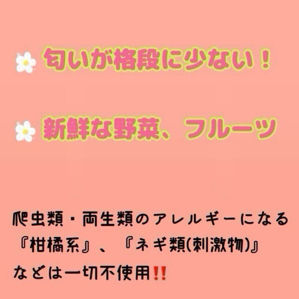 餌一覧 : 蒸し野菜、果物、きな粉、ビール酵母、貝殻、青米、蚕のさなぎ粉等