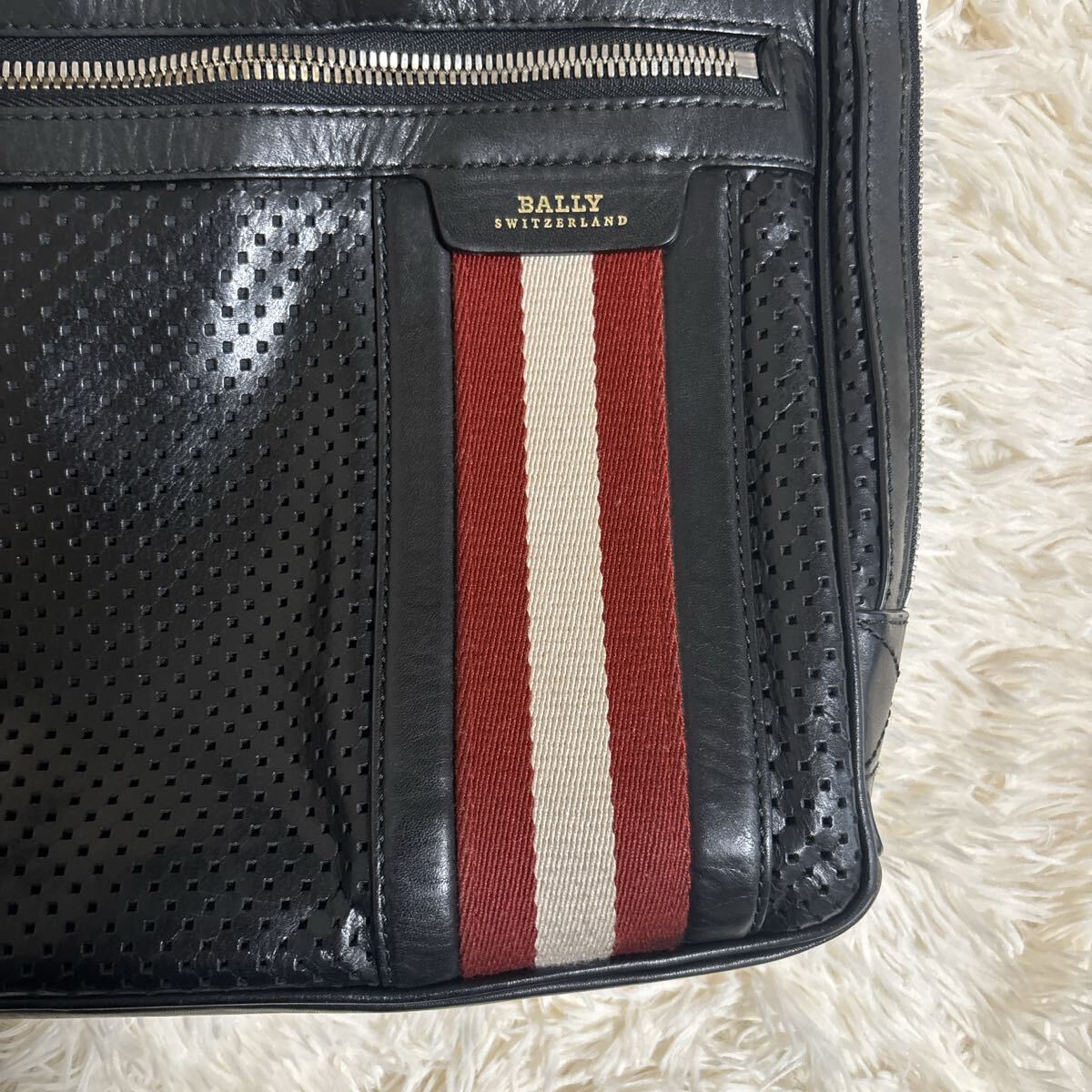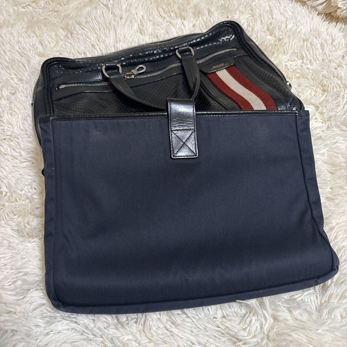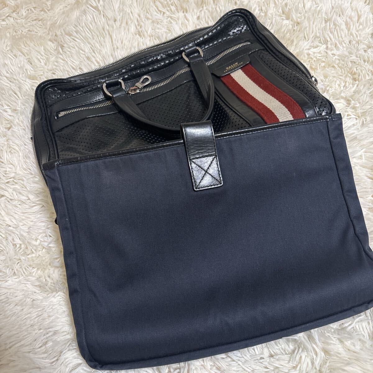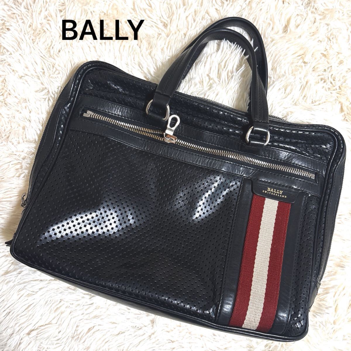バリー BALLY 黒のビジネスバッグ、赤と白のストライプデザイン、角に擦れあり。