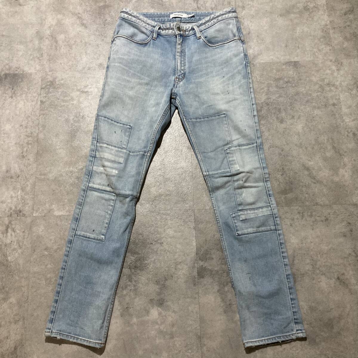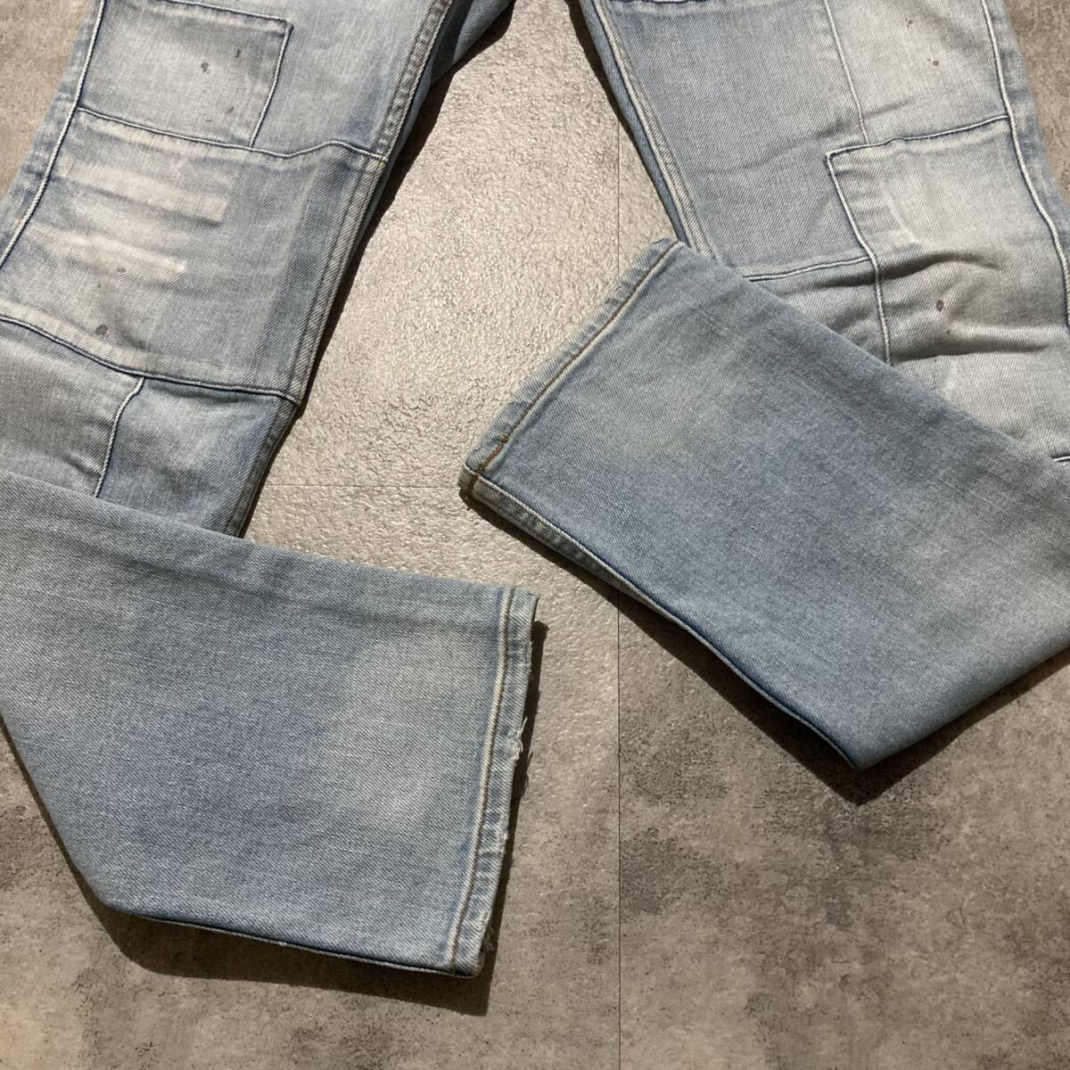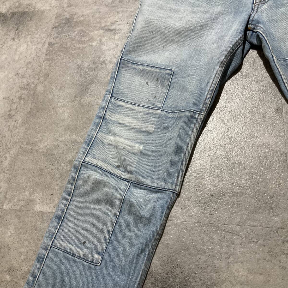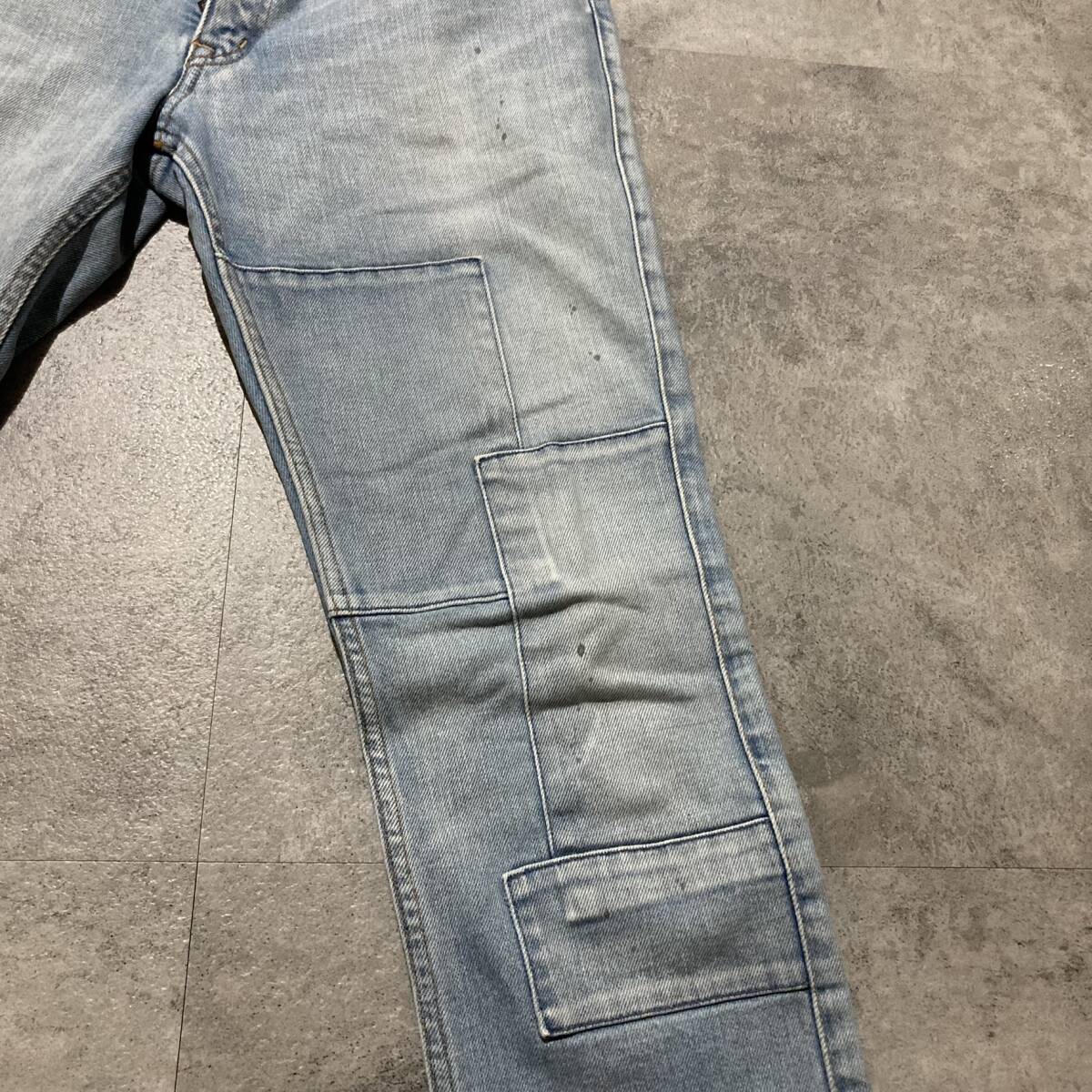 黒いインクが飛んだような汚れ加工が施されたデニムパンツ。
