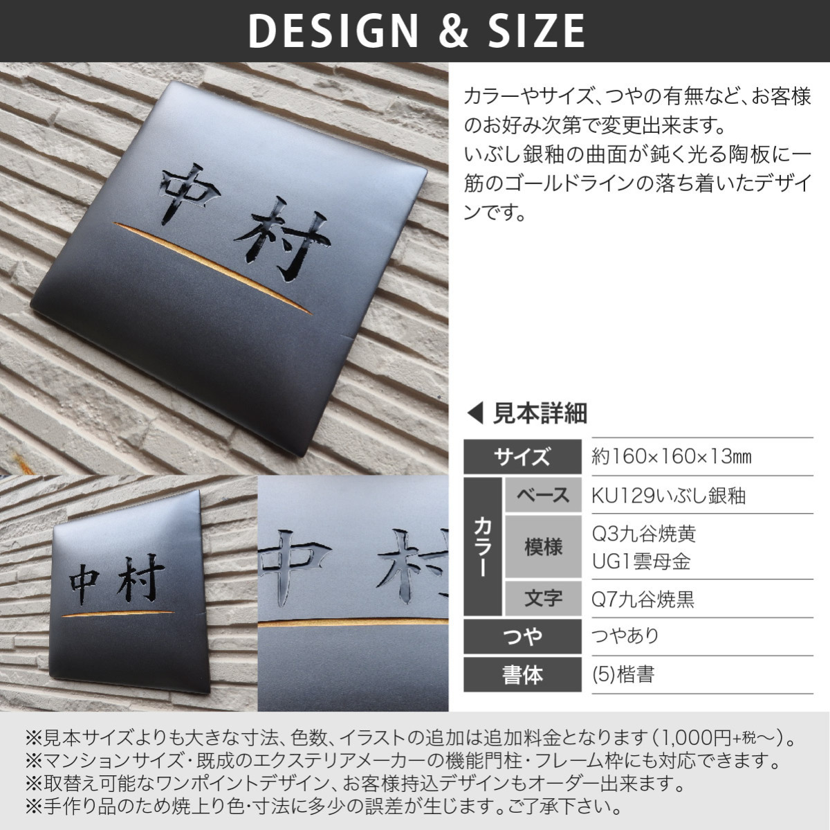 | 商品詳細 | カラーやサイズ、つやの有無など、お客様のお好み次第で変更出来ます。いぶし銀釉の曲面が鈍く光る陶板に一筋のゴールドラインの落ち着いたデザインです。 |