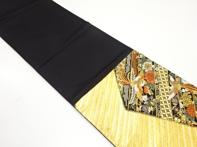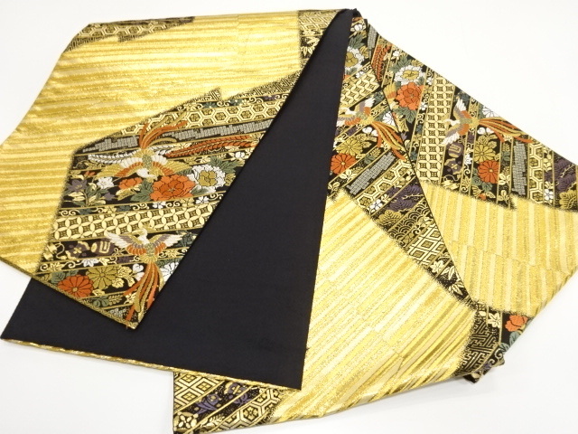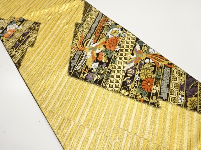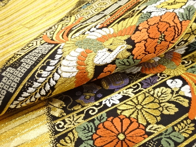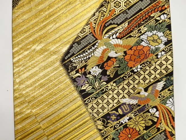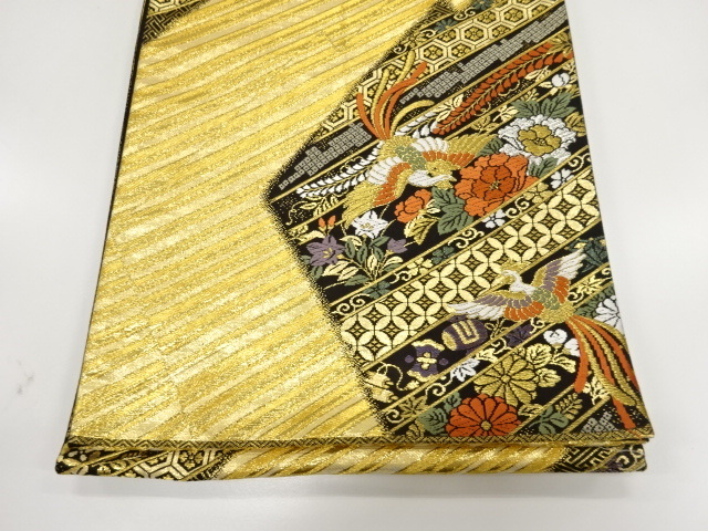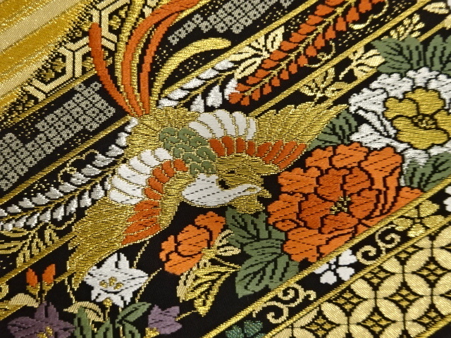 美品 斜め縞に鳳凰・牡丹・古典柄織り出し 振袖用 袋帯 (IE6K-020)