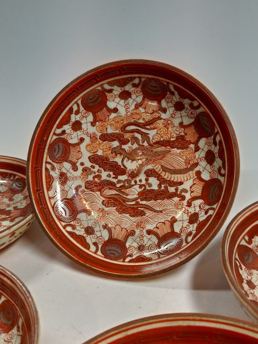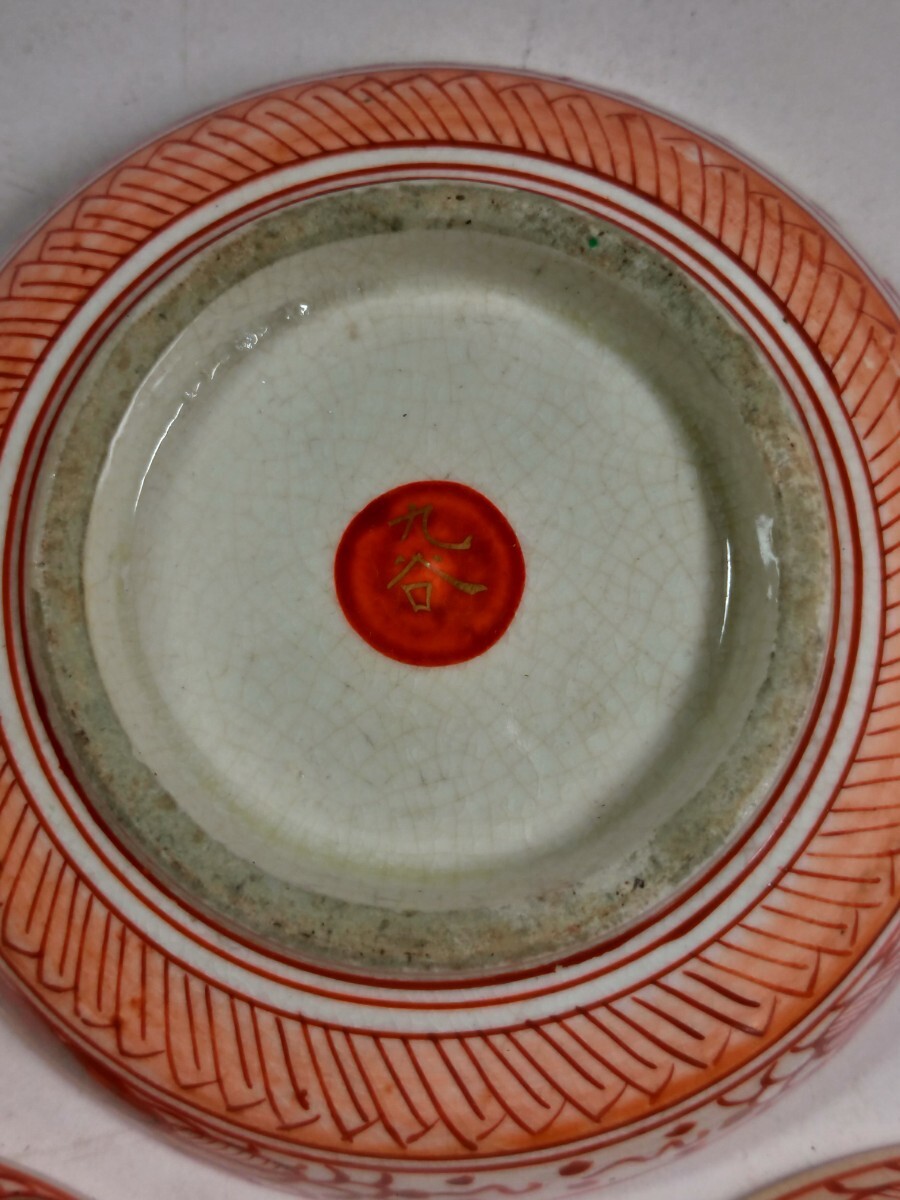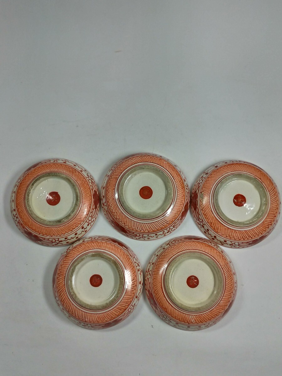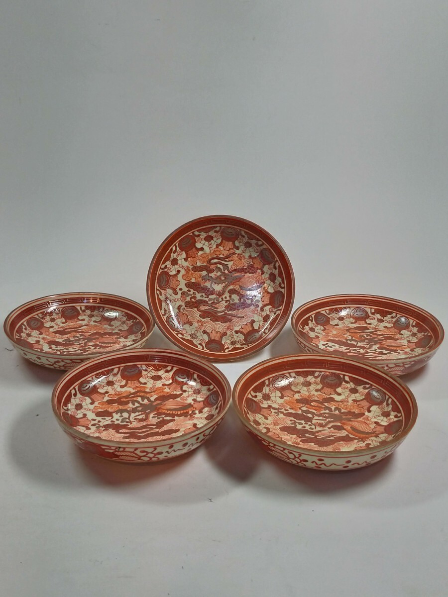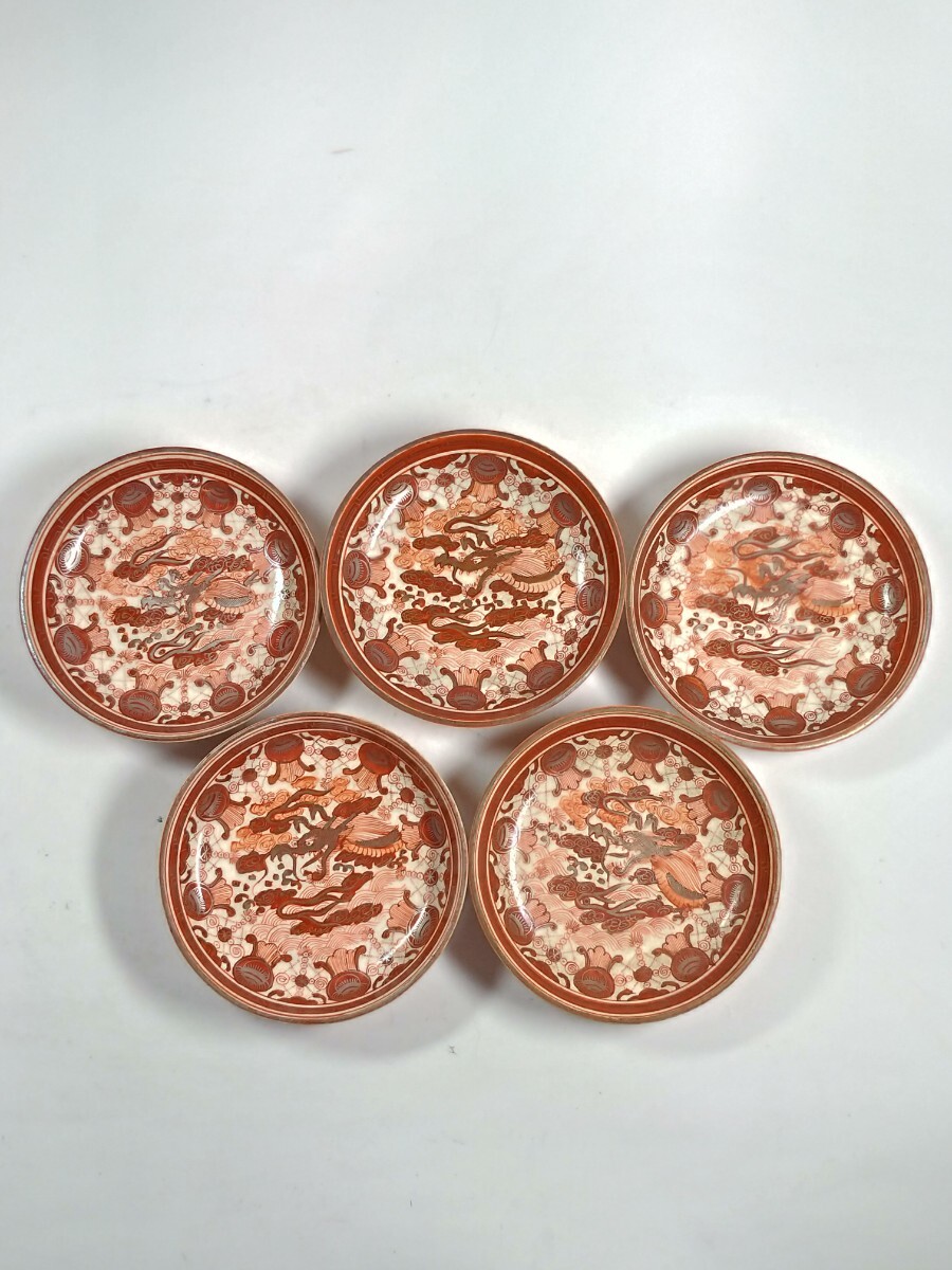 vmpd7-916-20 幕末~明治期 再興九谷 飯田屋八郎右衛門手 赤絵雲龍瓔珞文組皿五客 細密絵付