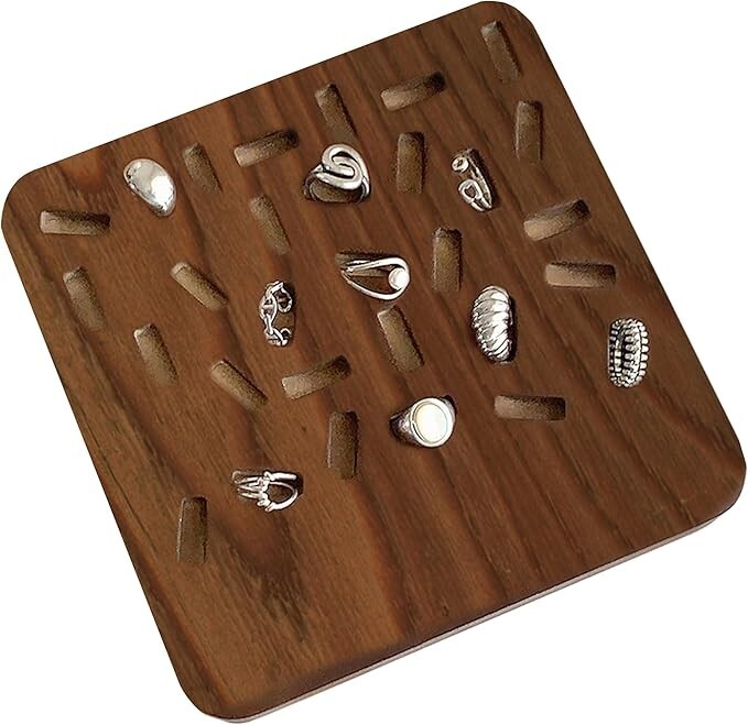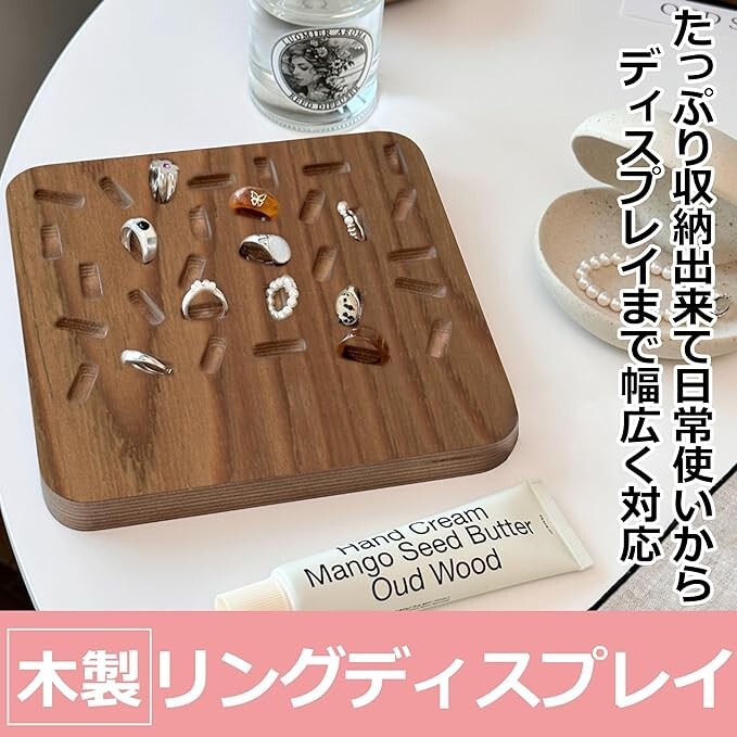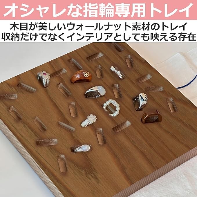 木製のオシャレな指輪専用トレイ:木目が美しいウォールナット素材のトレイは、リングの収納だけでなく、インテリアとしても映える存在です。不規則な配置ができる形状が特徴で、指輪をひとつ置くだけでも雰囲気のある空間に仕上がります。