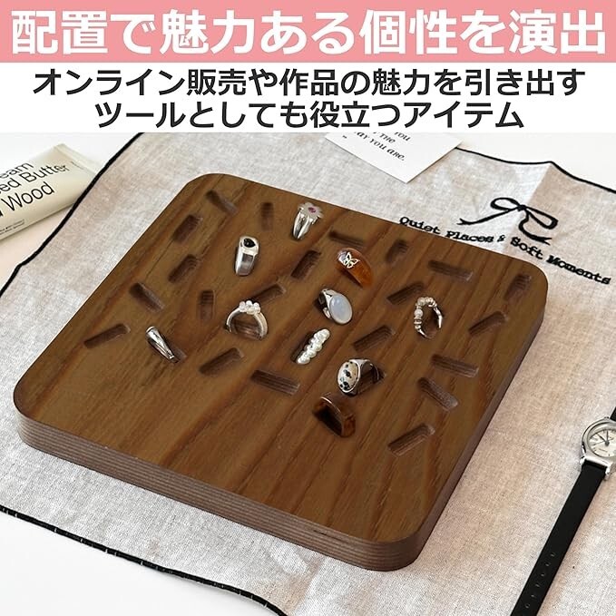 見せ方にこだわる場面にも:店舗での展示はもちろん、写真撮影用のアイテムとしても映えるため、オンライン販売や作品の魅力を引き出すツールとしても役立ちます。不規則な指輪の配置設定が、他にはない個性を演出できます。
