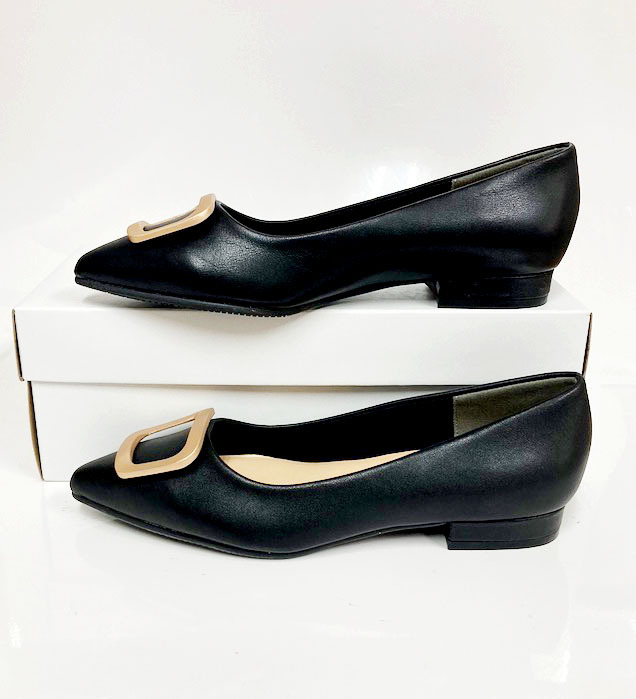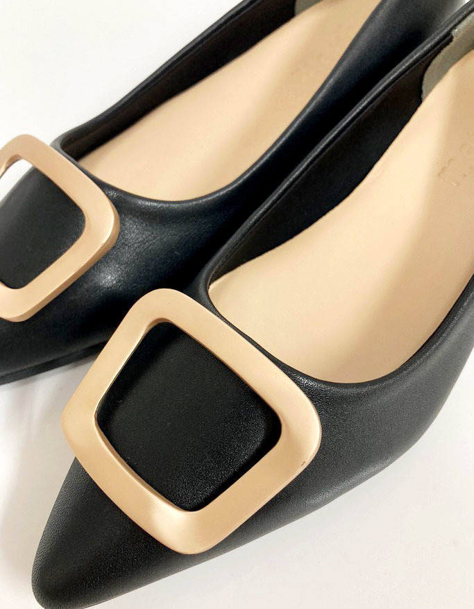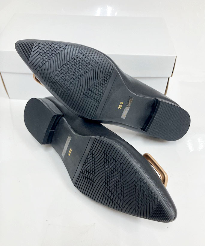 大きめのゴールドバックルがアクセントになったデザインで、シンプルながら高級感のある一足。