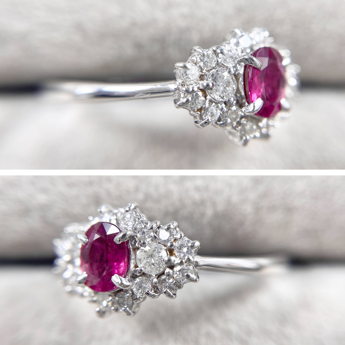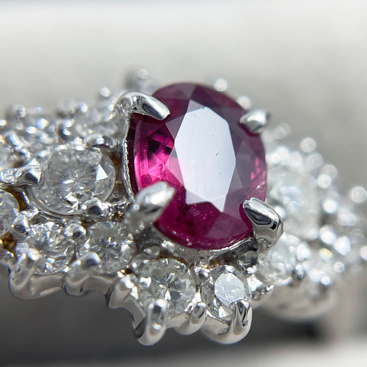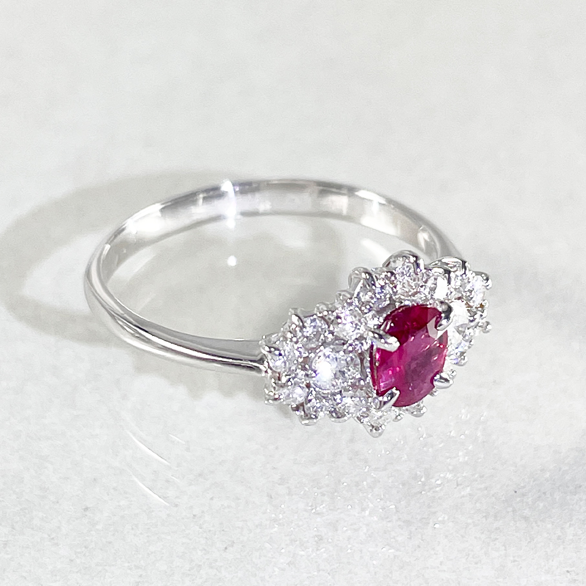 深紅に輝くルビーをセンターに配し、ダイヤモンドで華やかに囲んだリング。