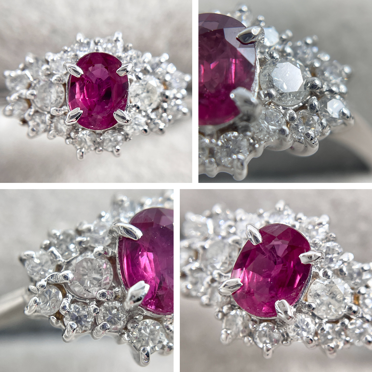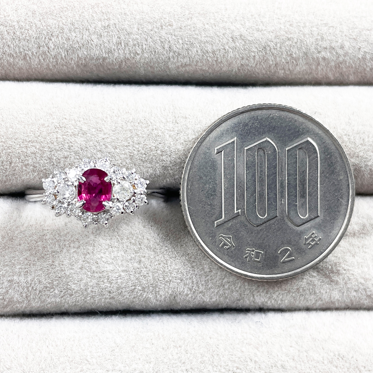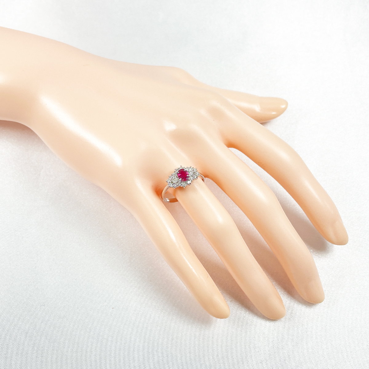深紅に輝くルビーをセンターに配し、ダイヤモンドで華やかに囲んだリング。