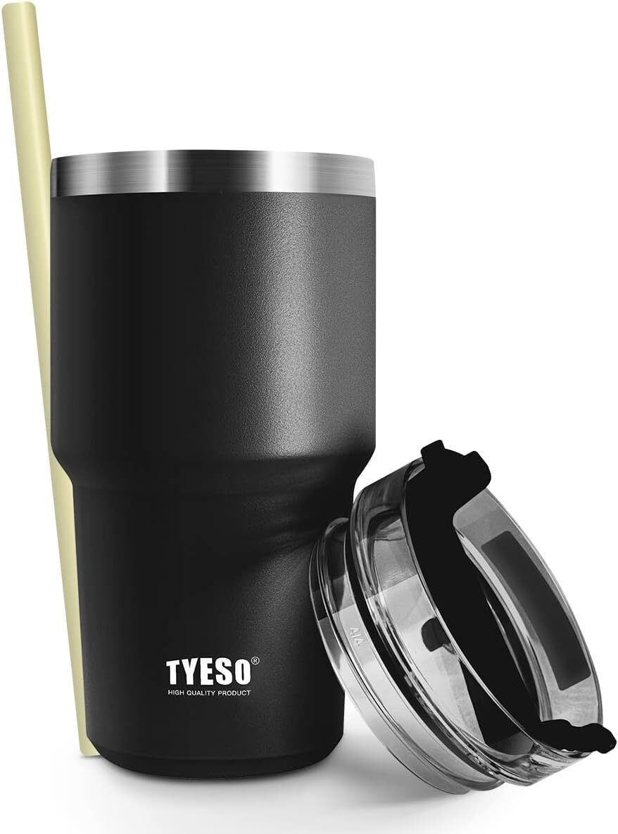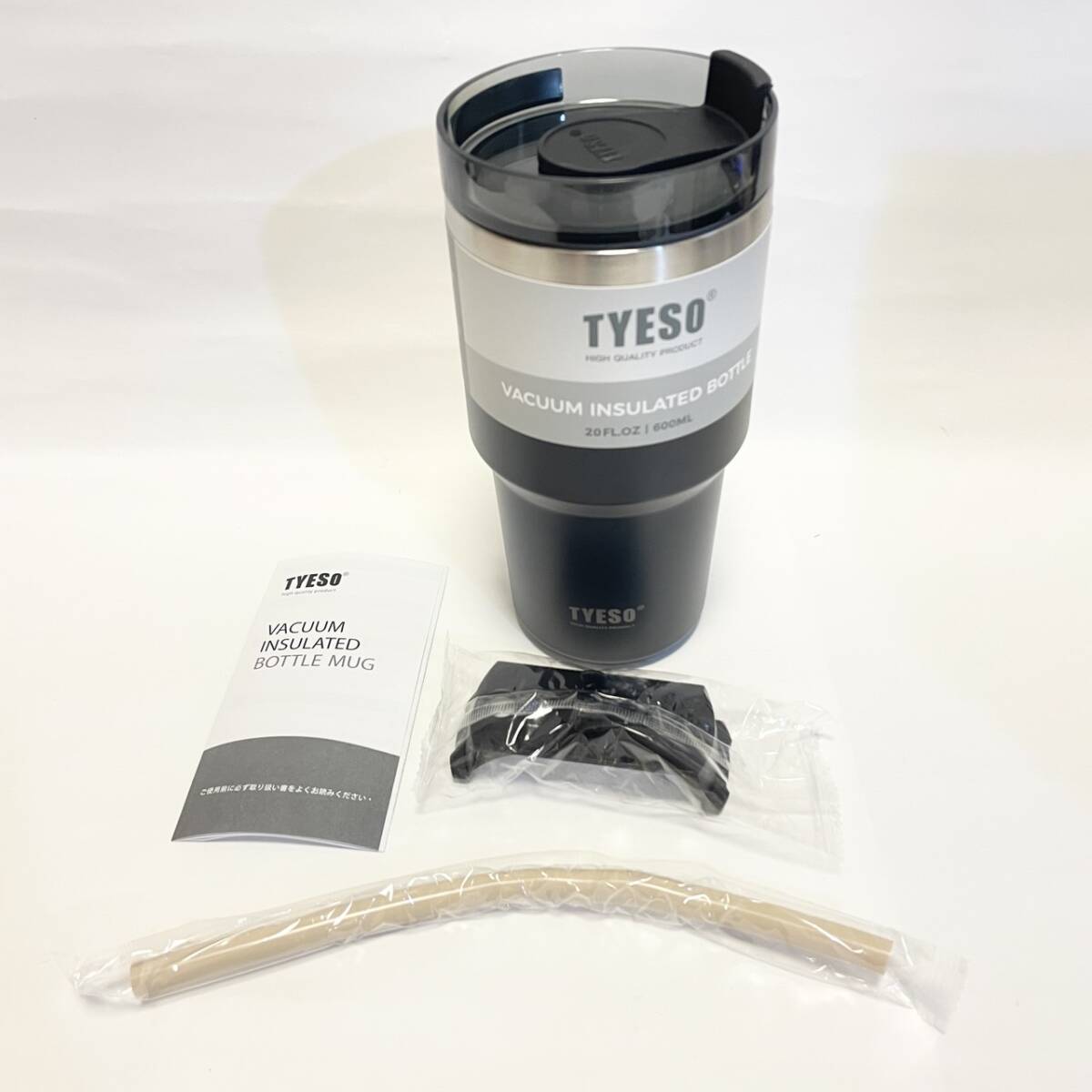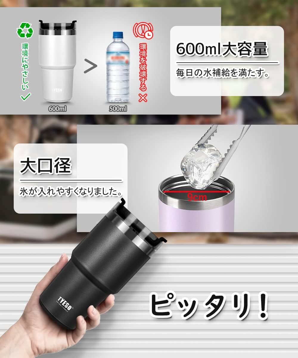 【日本限り】TYESO タンブラー ストロー付き 水筒 ボトル スポーツボトル ストローボトル ふた付き 真空断熱 600ml 真空クエンチャー 魔法瓶 運動 多色 直飲み 保温 保冷 ジョッキ 大容量 広口 持ち運び 3WAYふた アウトドア スポーツ観戦 (ブラック)