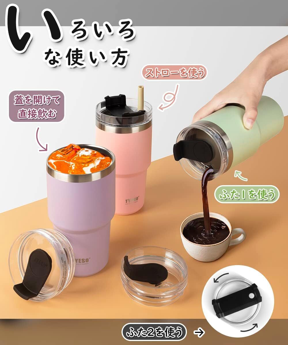 ★【漏れ防止・滑り止め・汗防止】水筒の表面はつや消しの質感と人間工学的科学に適合する溝のデザインされており、滑りにくく、摩擦に強いです。 汗をかいたり濡れたりしても握りやすい運動水筒 です。【パッケージ内容】タンブラー本体×1、ふた×1、ふた交換用付属品×1、ストロー×1。TYESO 水筒につきまして、何かご不明な点等ございましたら、お気軽にお問い合わせくださいませ。 ビデオのタンブラーに印刷されたロゴは撮影用のものですので、予めご了承ください。実際の商品の外観は、商品画像をご参照ください。