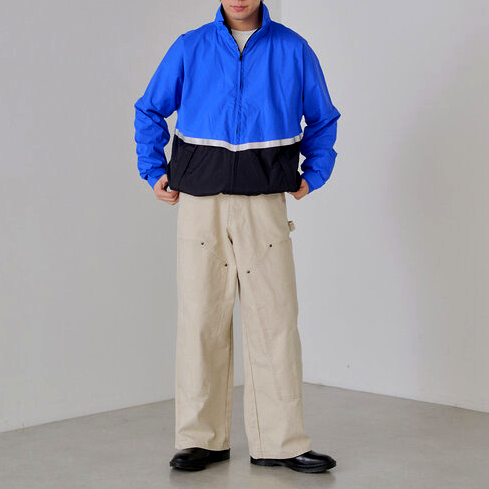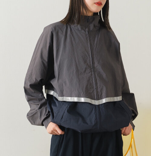 薄手のナイロン素材を使用し、ナイロンジャケット型、オーバーサイズ、軽量仕立て、ダブルジップ、メッシュの総裏地、2ポケットなど、細部まで凝ったデザインです。